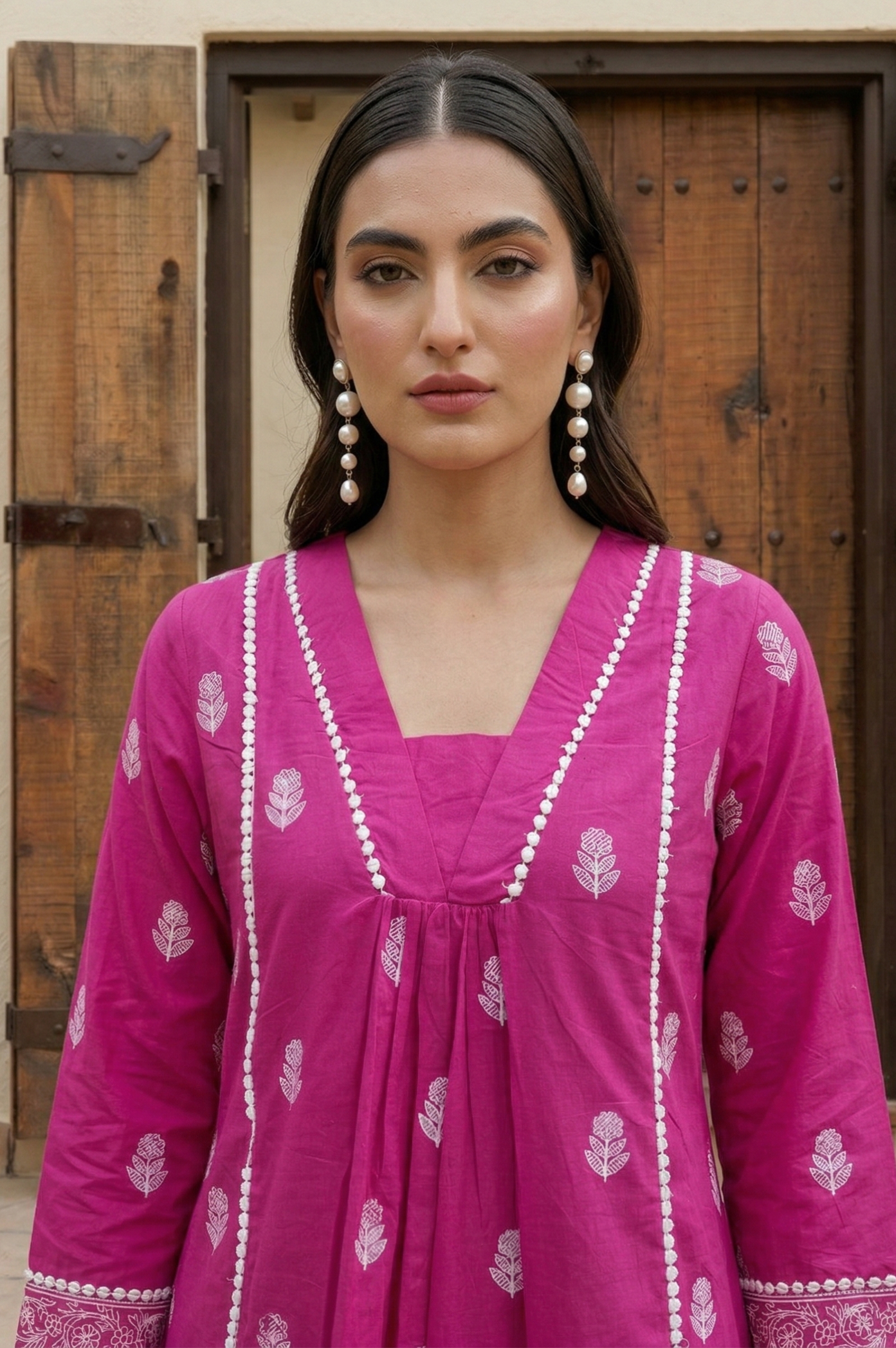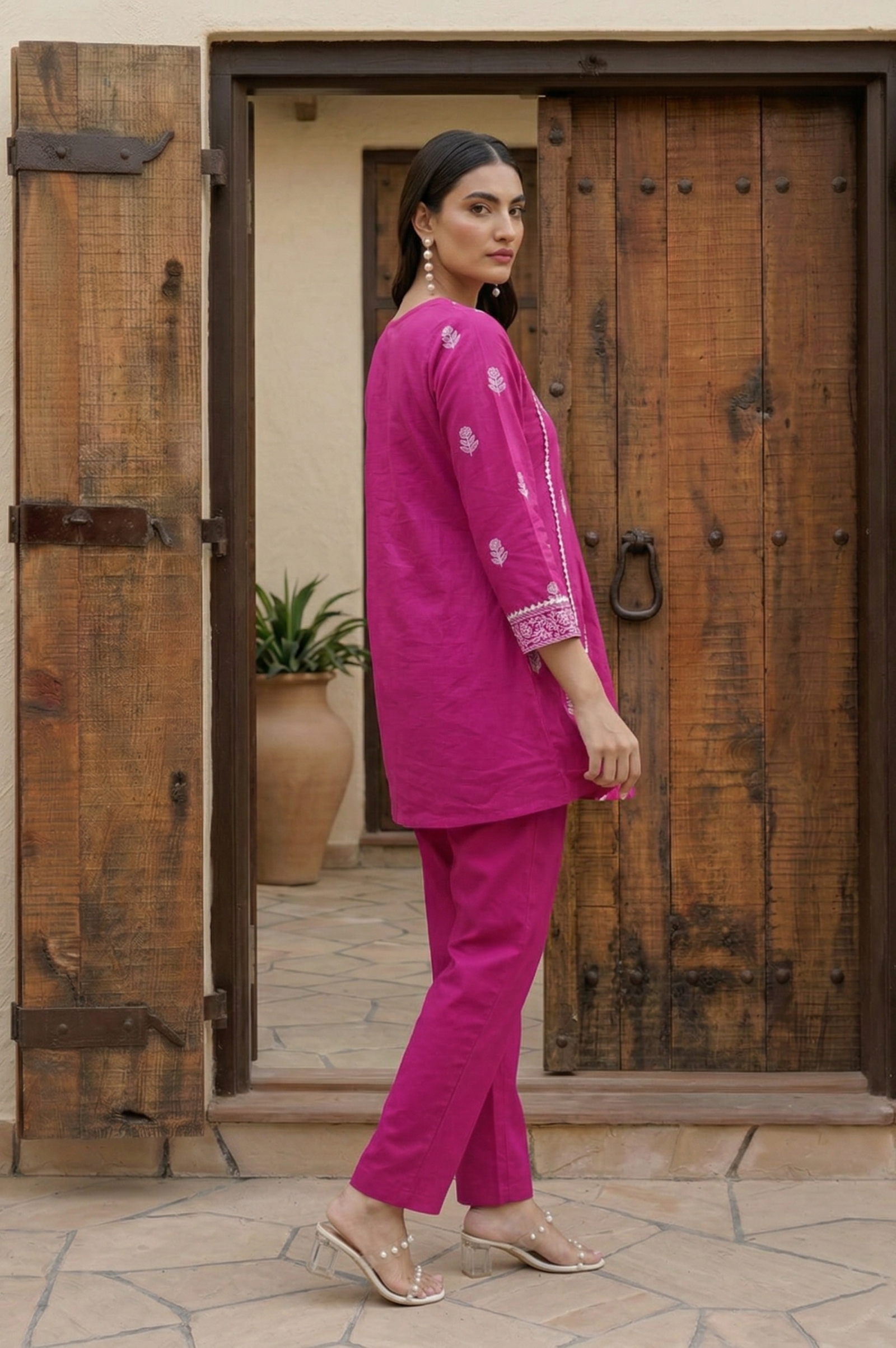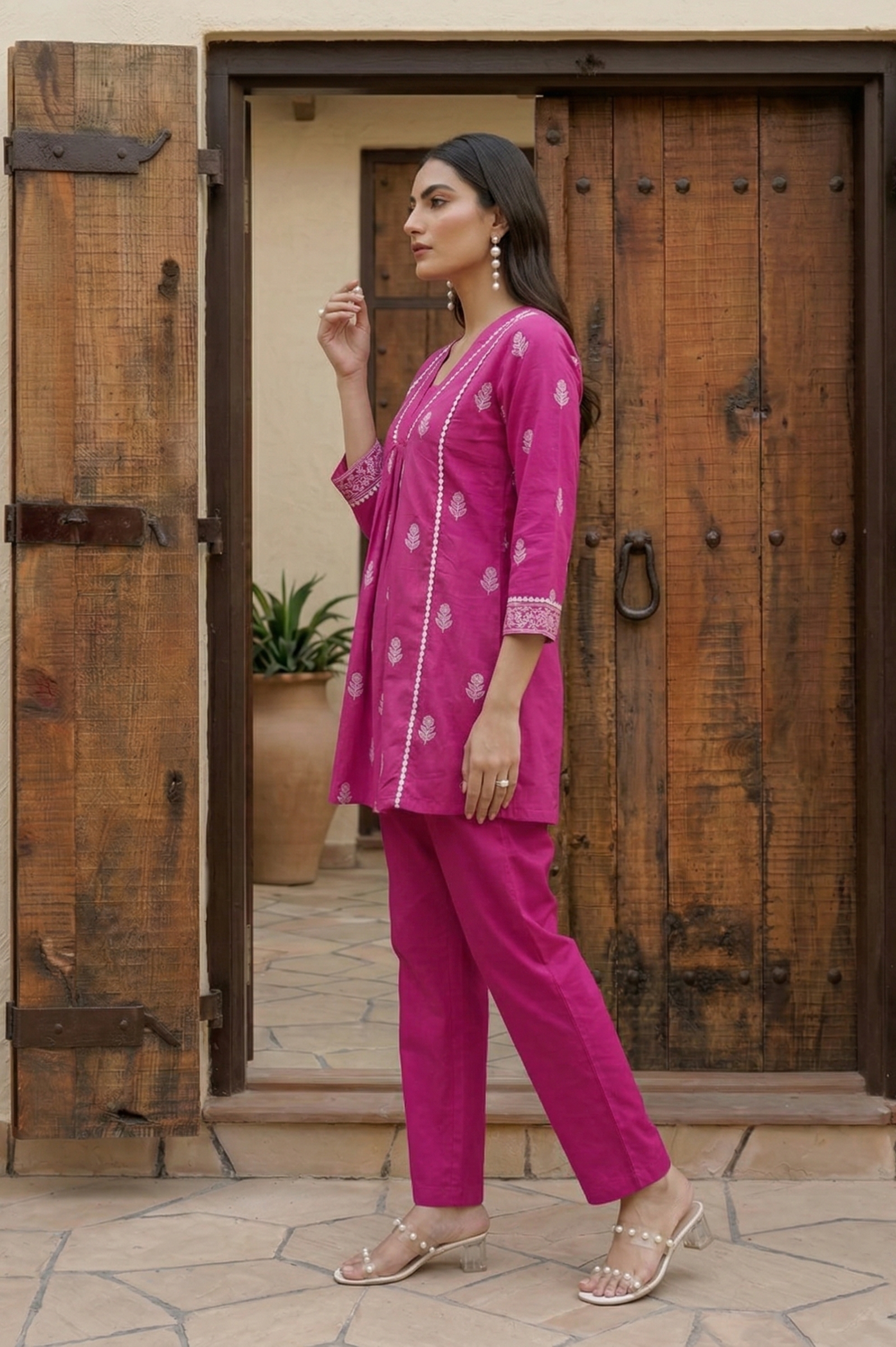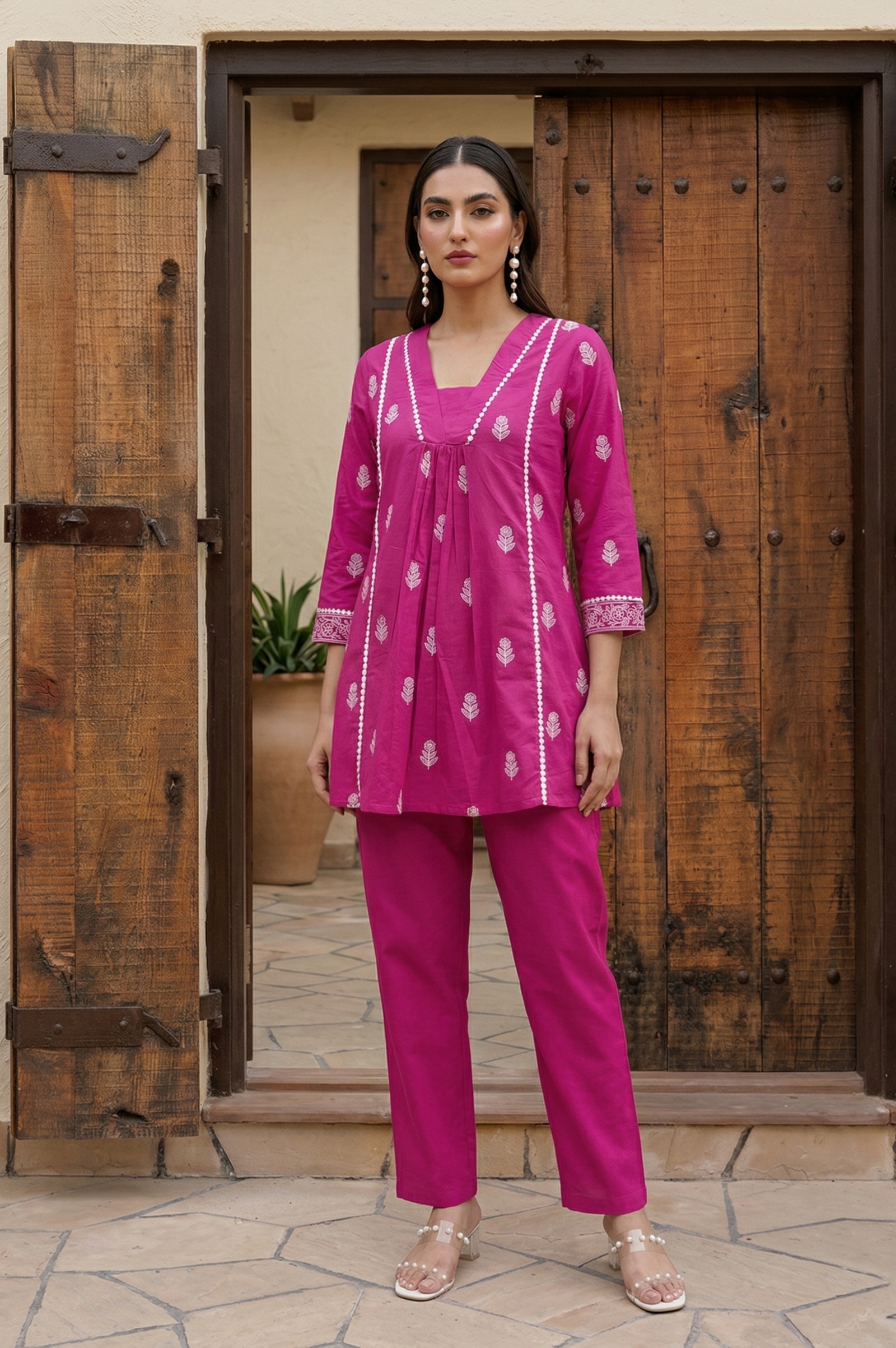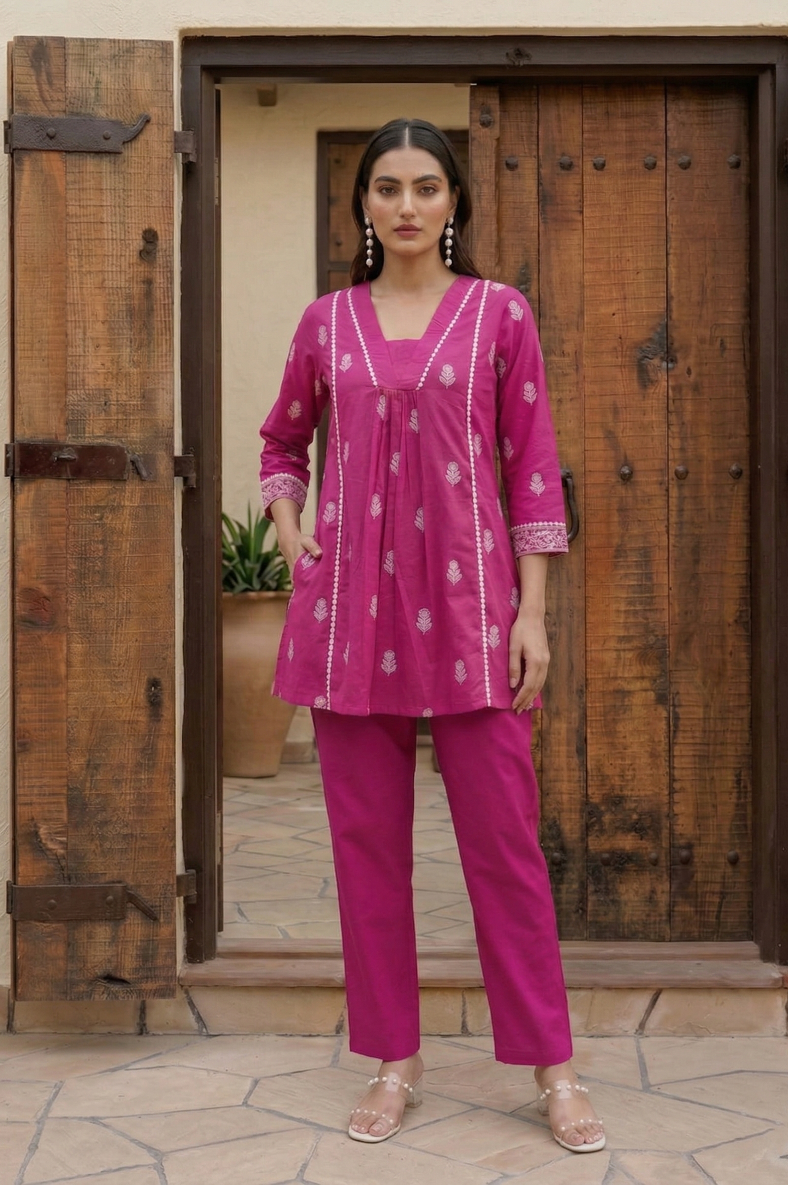 The elegant baby pink cotton co-ord set with schiffli embroidery adds a soft feminine touch, while the V-neck design and 3/4 sleeves enhance its modern ethnic appeal. Whether you're styling it for brunch, office wear, or festive gatherings, this cotton schiffli embroidered outfit ensures all-day comfort with a stylish look.