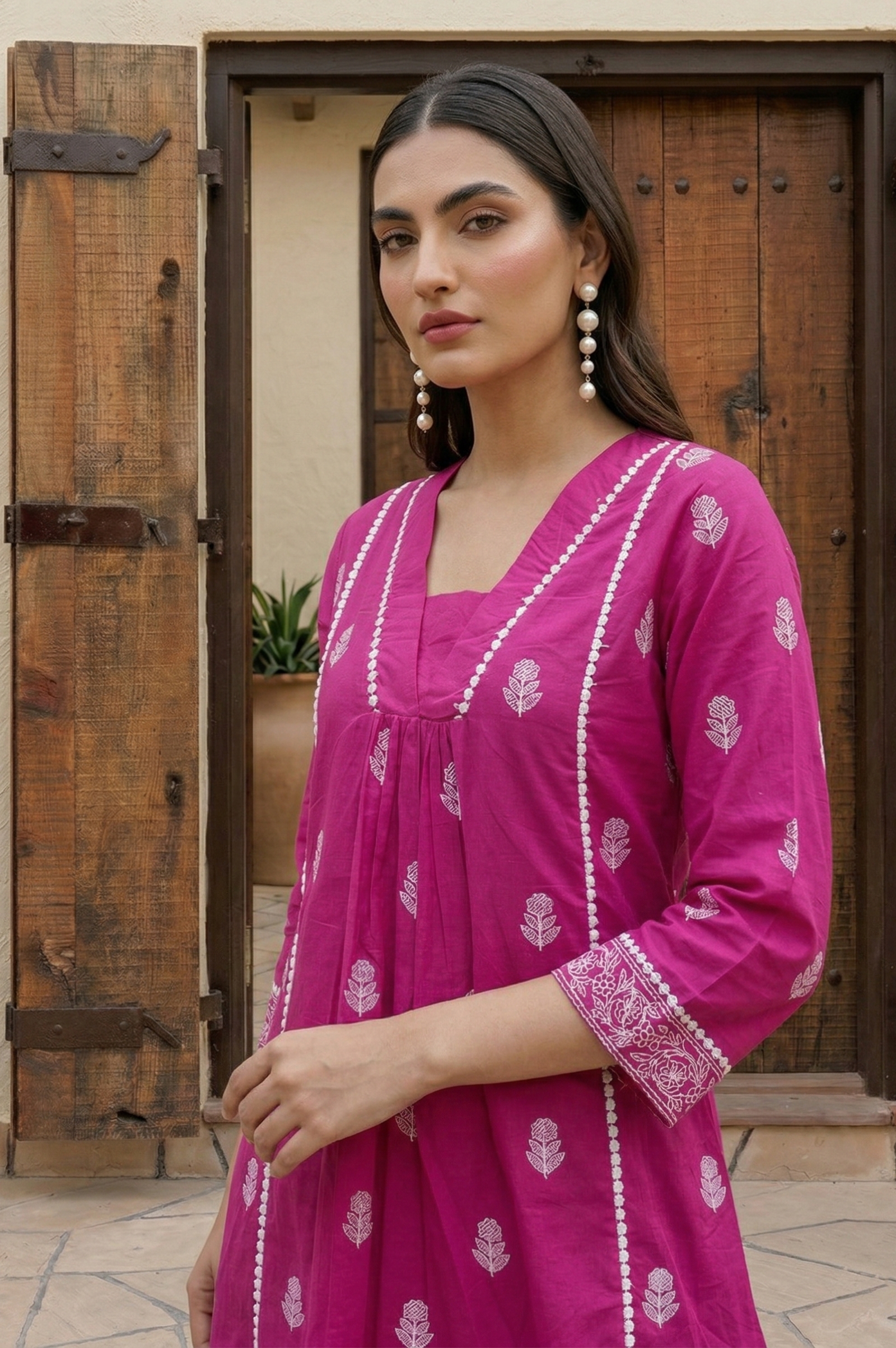 The top is crafted from pure cotton schiffli fabric, featuring a stylish fit-and-flare silhouette that offers both comfort and elegance. Designed with a V-neckline and 3/4th regular sleeves, this mid-length kurta provides a flattering shape while maintaining a breathable and lightweight feel—ideal for warm weather and all-day wear.