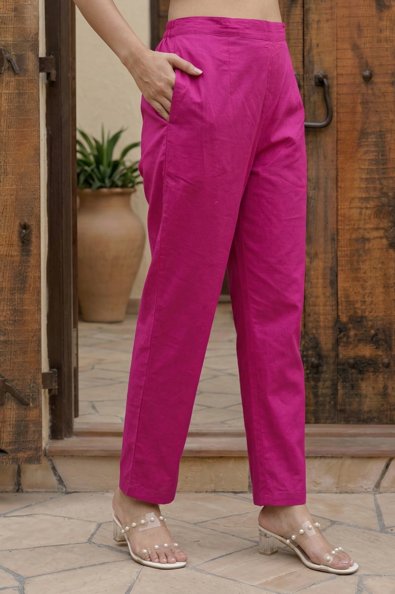 The bottom is made from pure cotton fabric, designed as full-length pants that ensure comfort and ease of movement. The minimal design complements the embroidered top, creating a balanced and versatile ethnic co-ord look suitable for casual and semi-formal occasions.