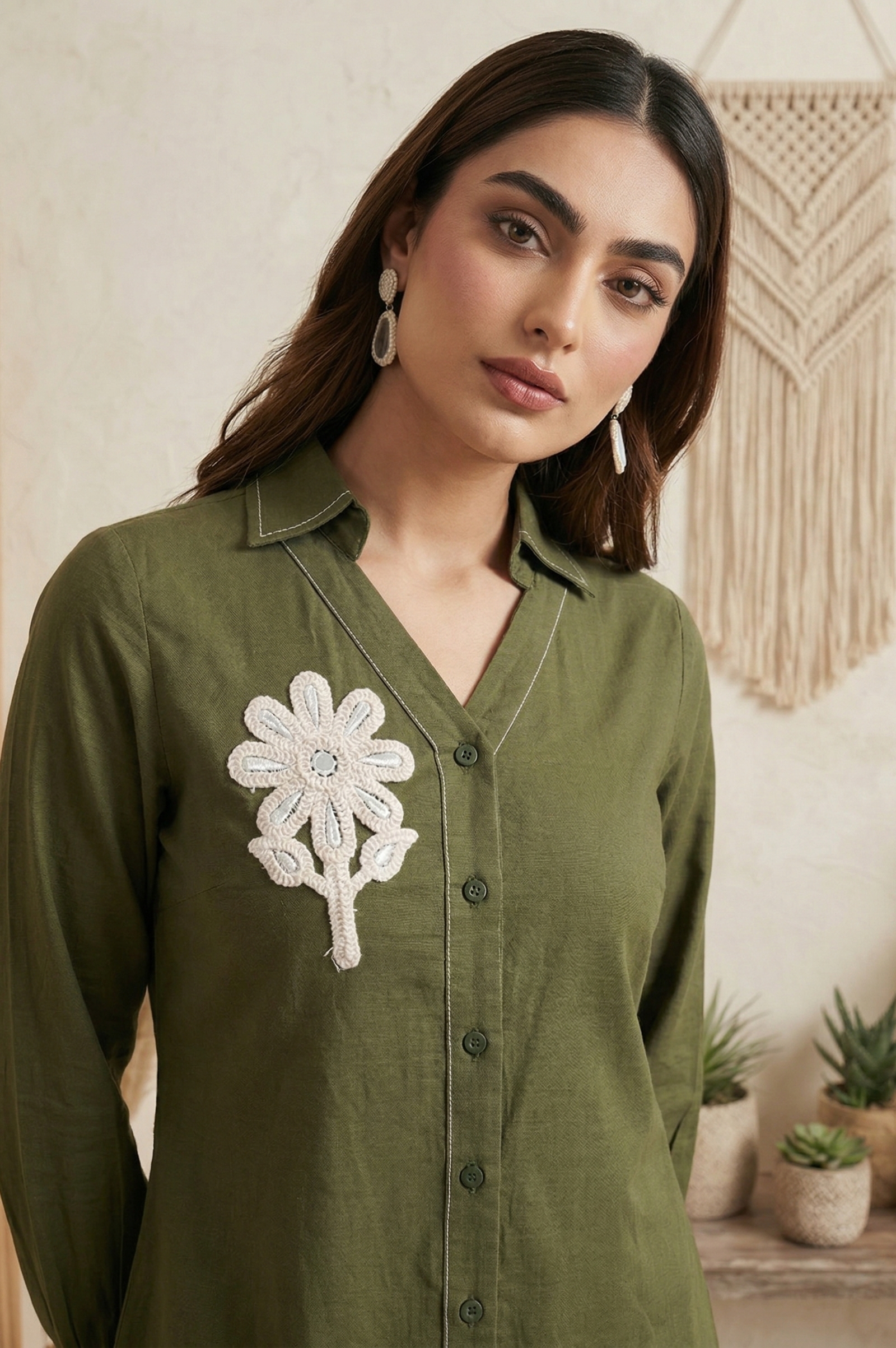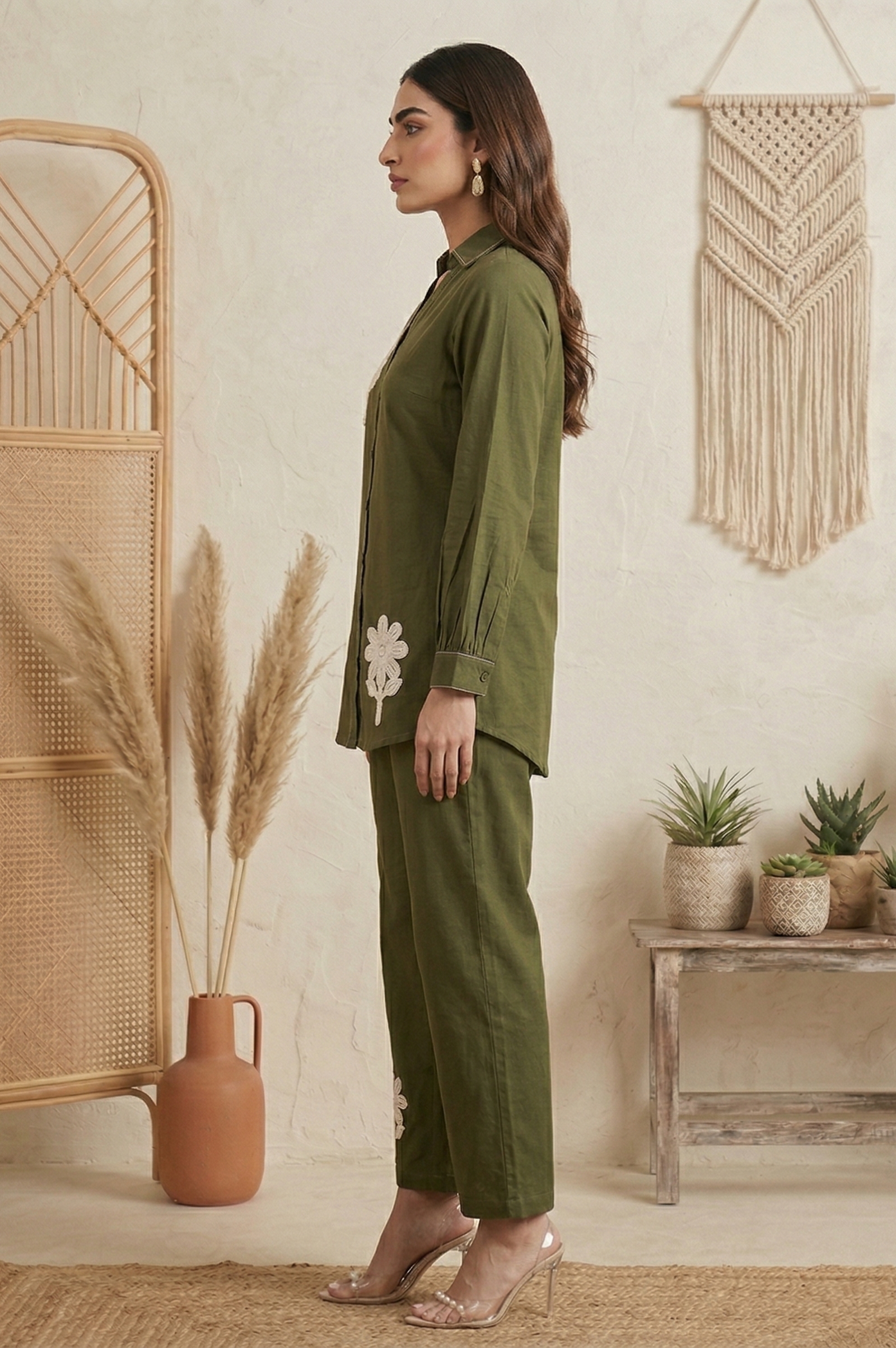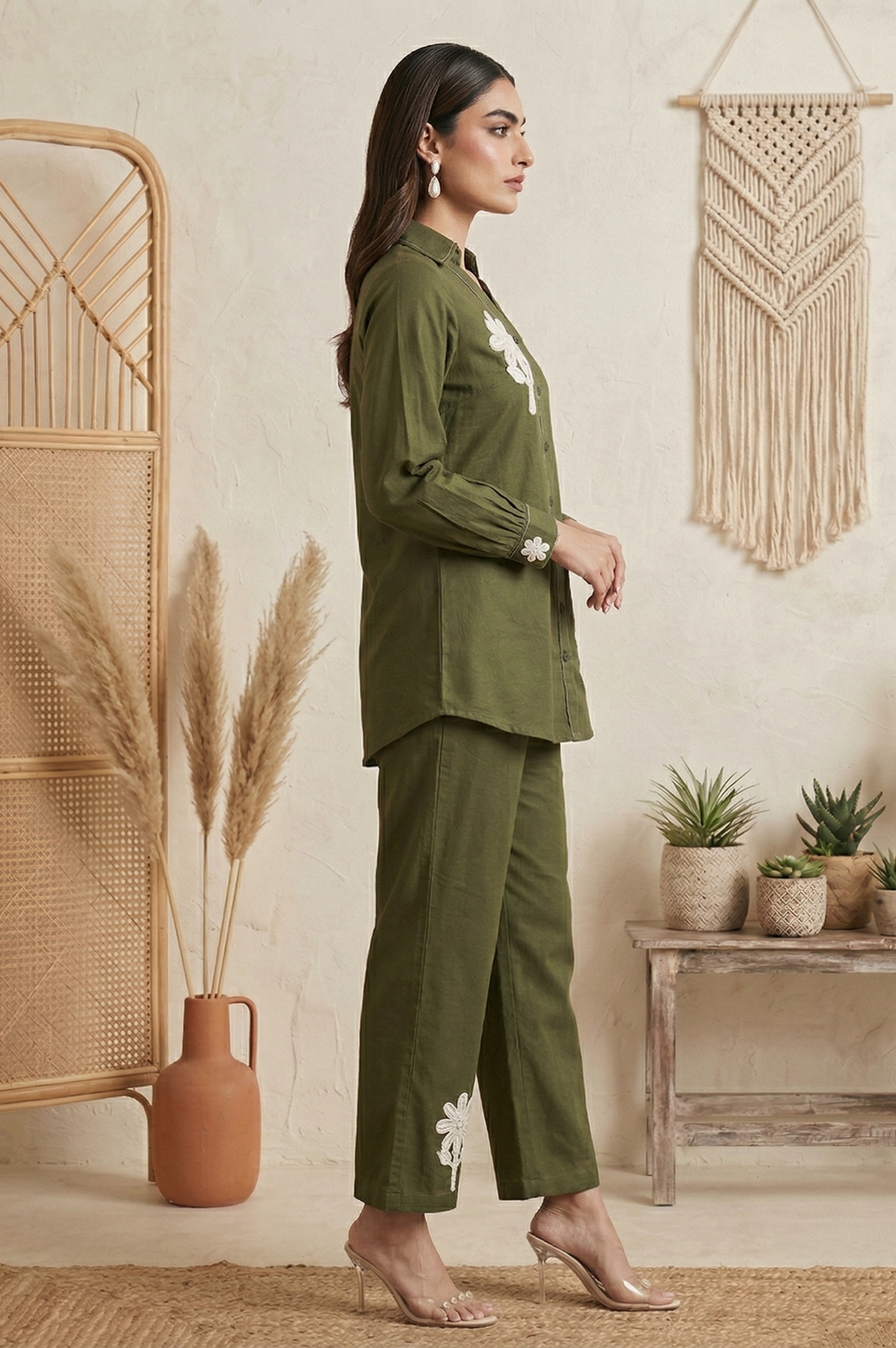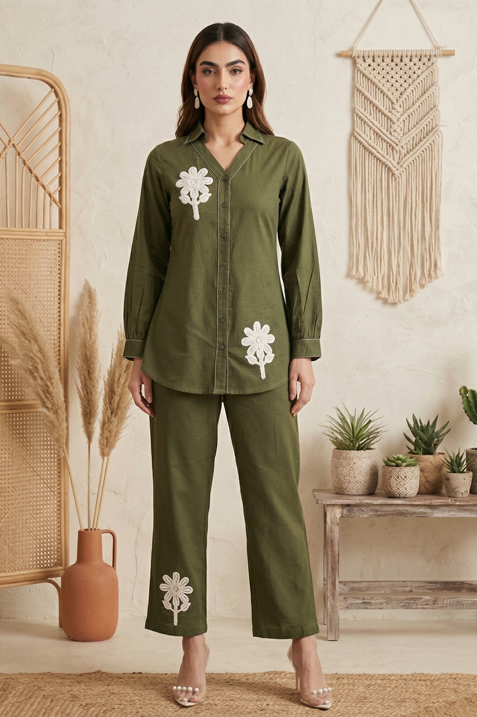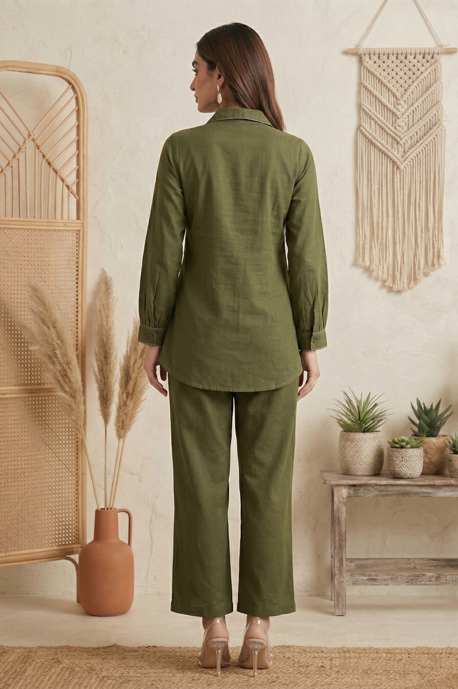 The subtle embroidered butta pattern adds a touch of traditional charm, while the collared neckline and 3/4th sleeves give it a modern, structured look. This Dark Green cotton co-ord set is perfect for women looking for a balance of sophistication and comfort in their everyday ethnic outfits.