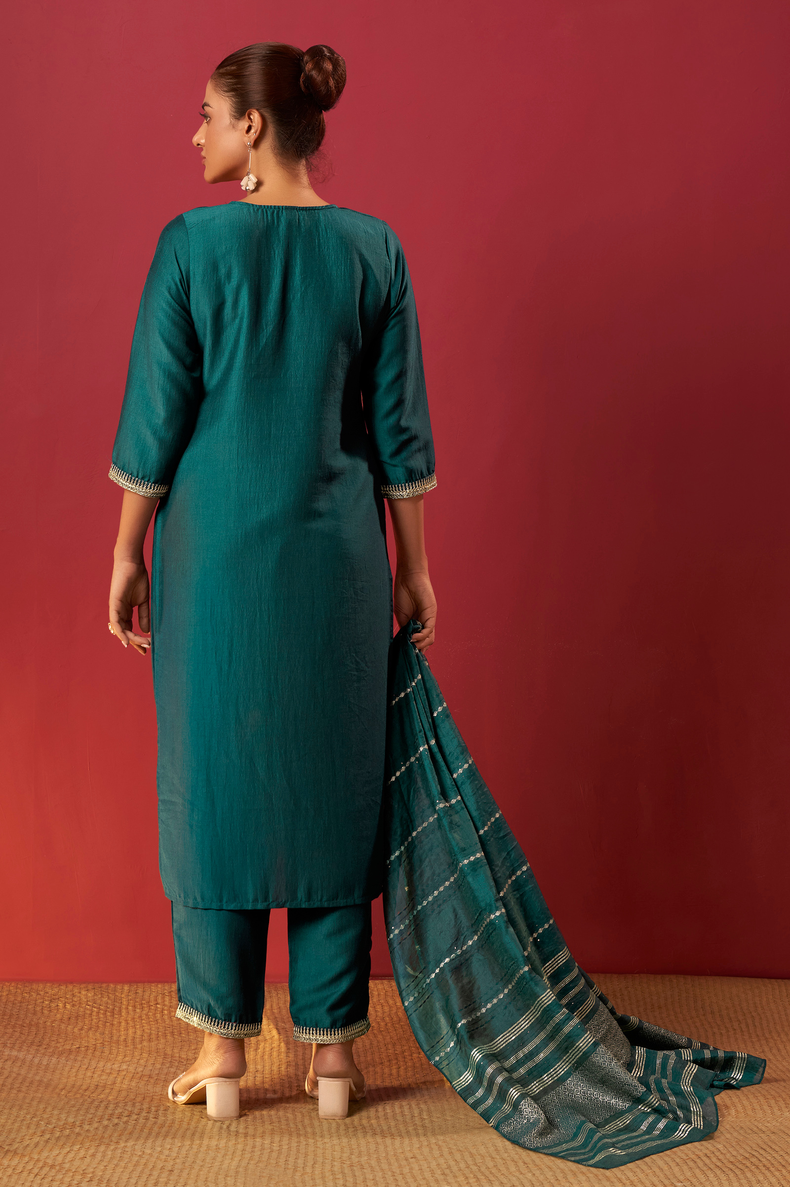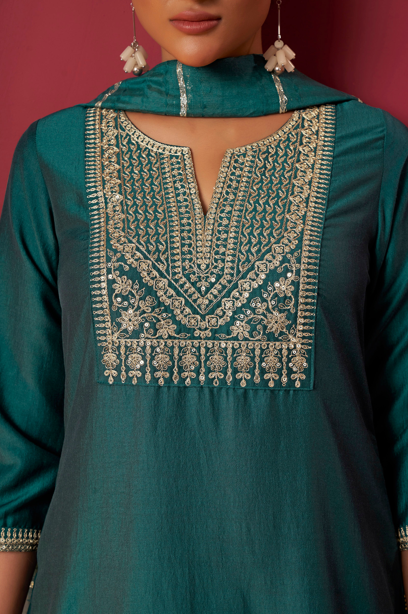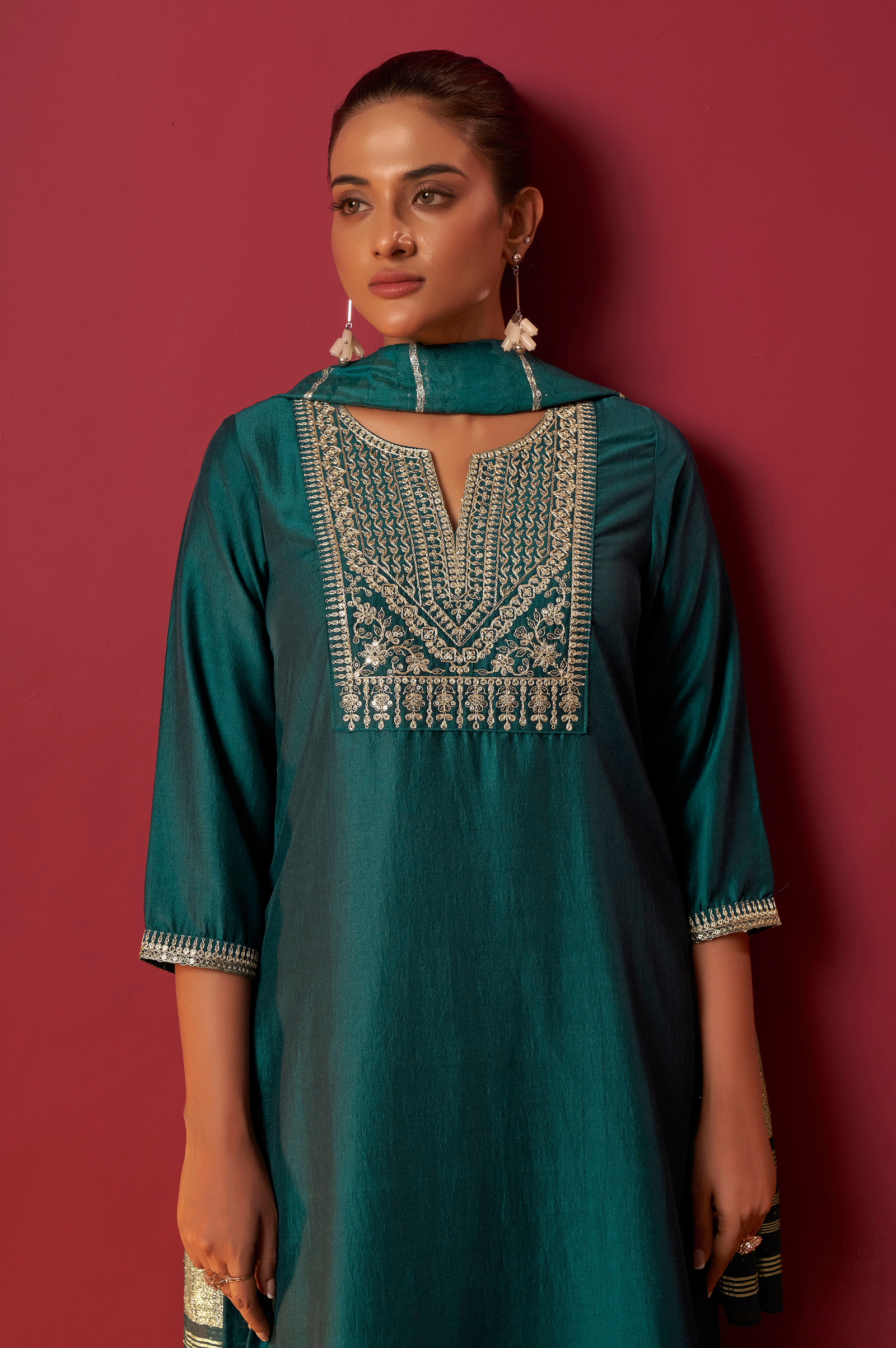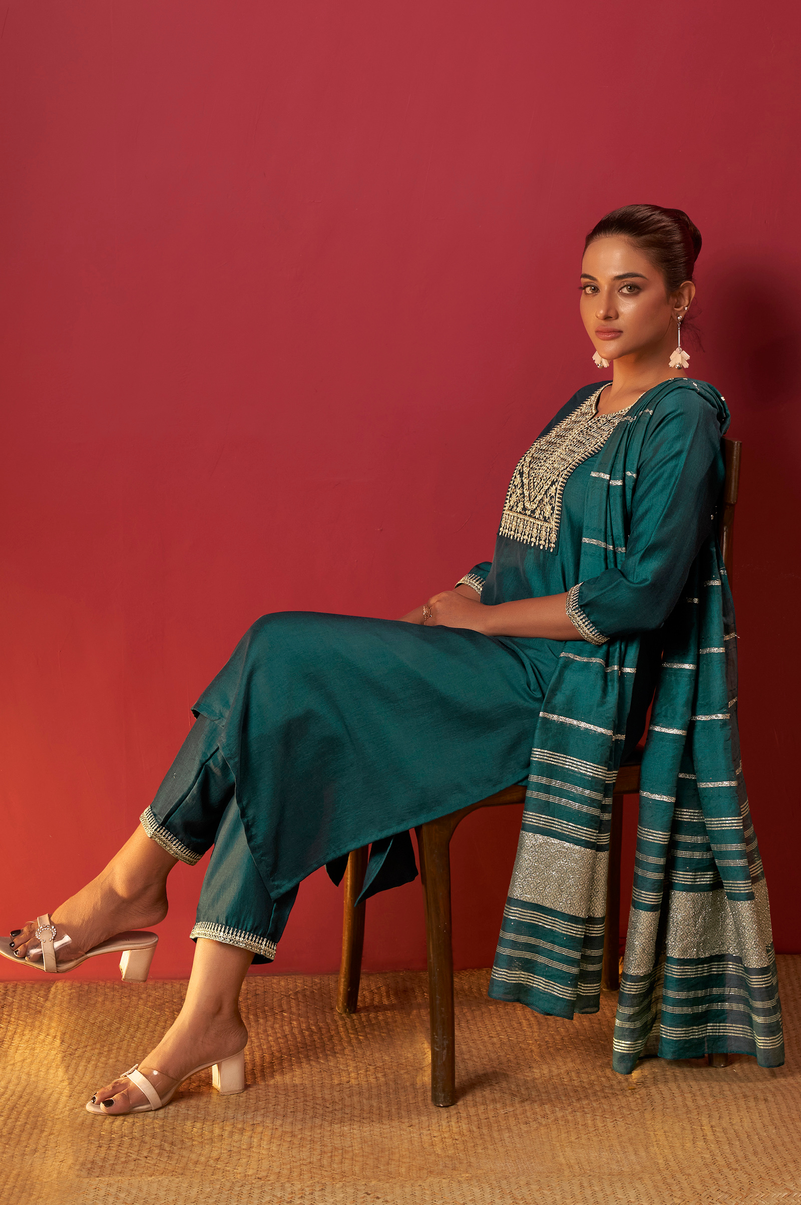 Grace meets comfort in this Green cotton blend embroidered kurta set with a matching dupatta.