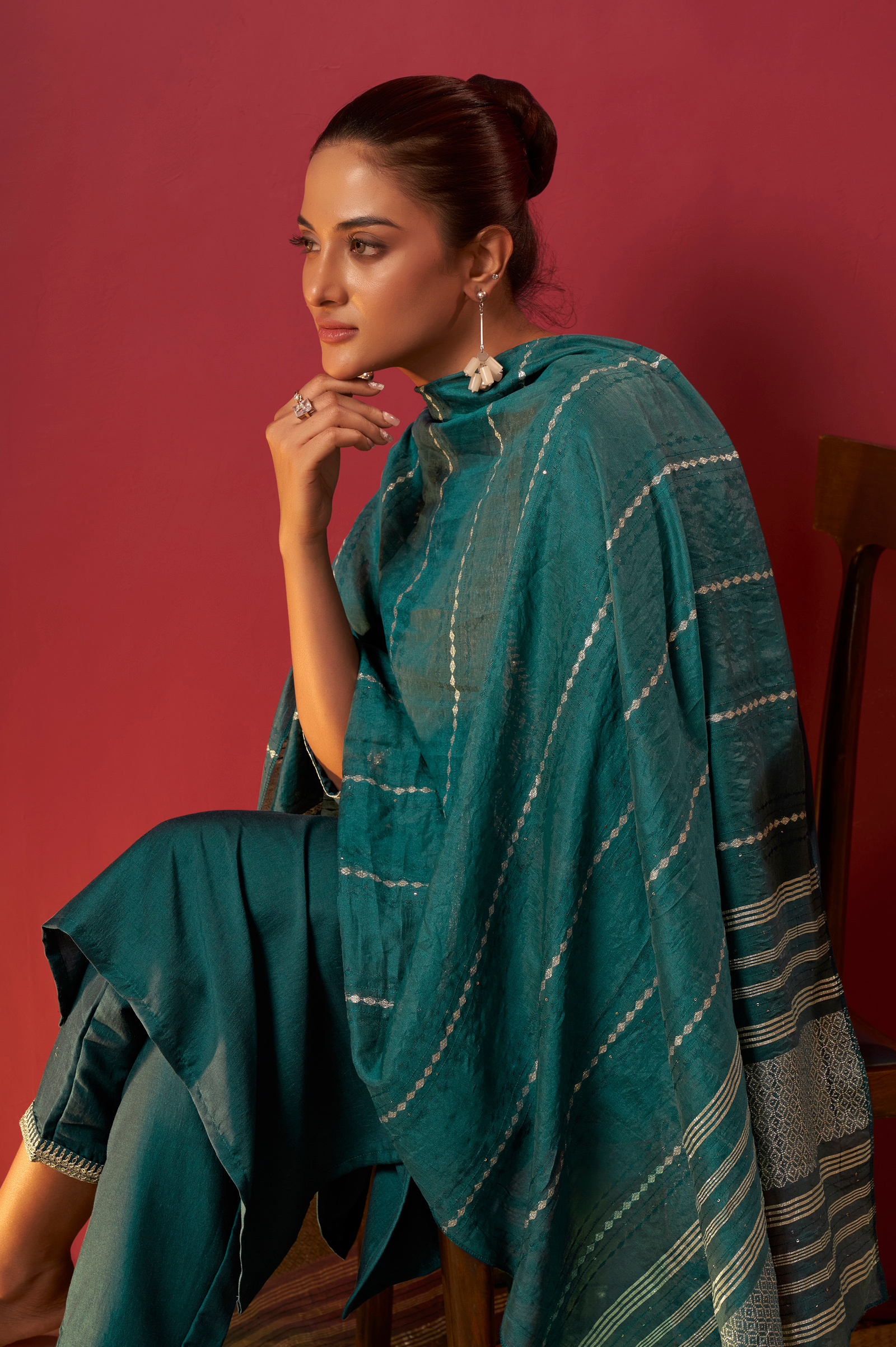 Green Chinon Embroidered Kurta Set with Jacquard Dupatta