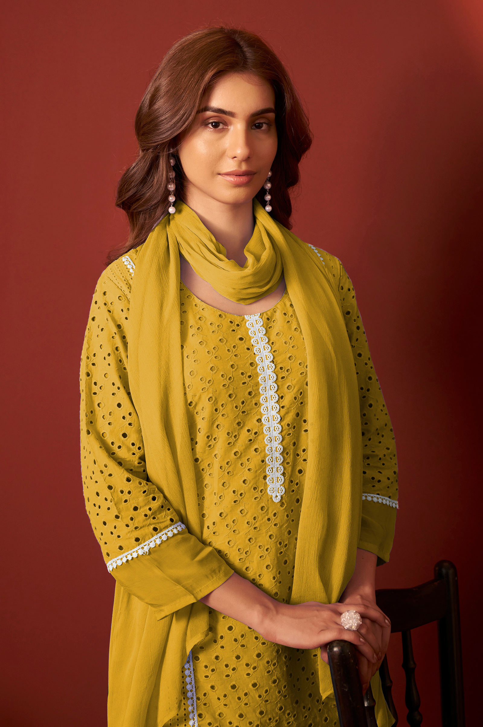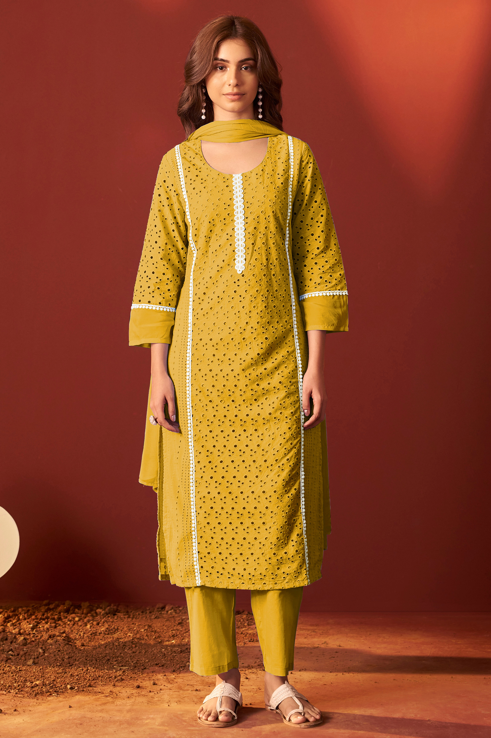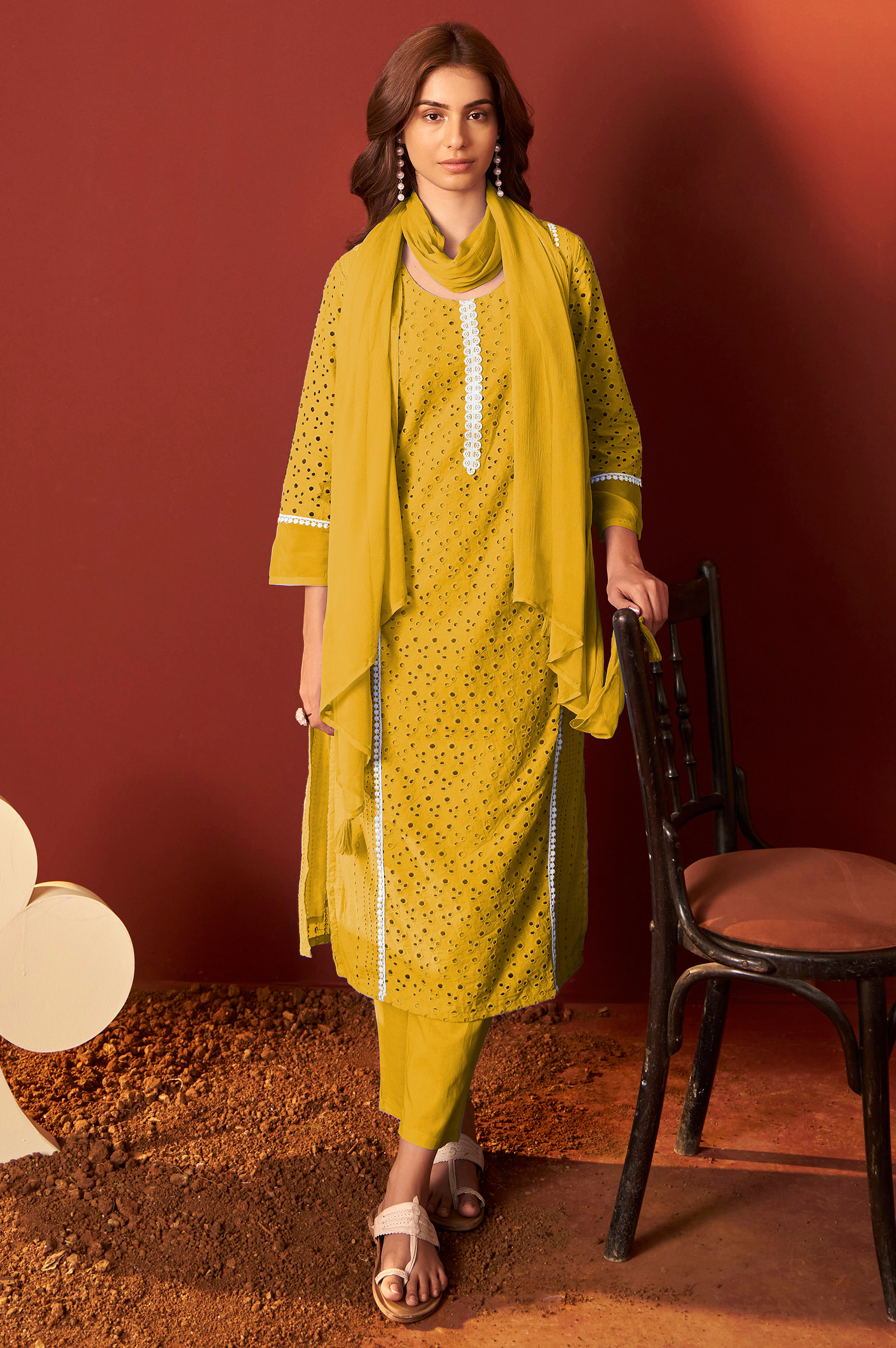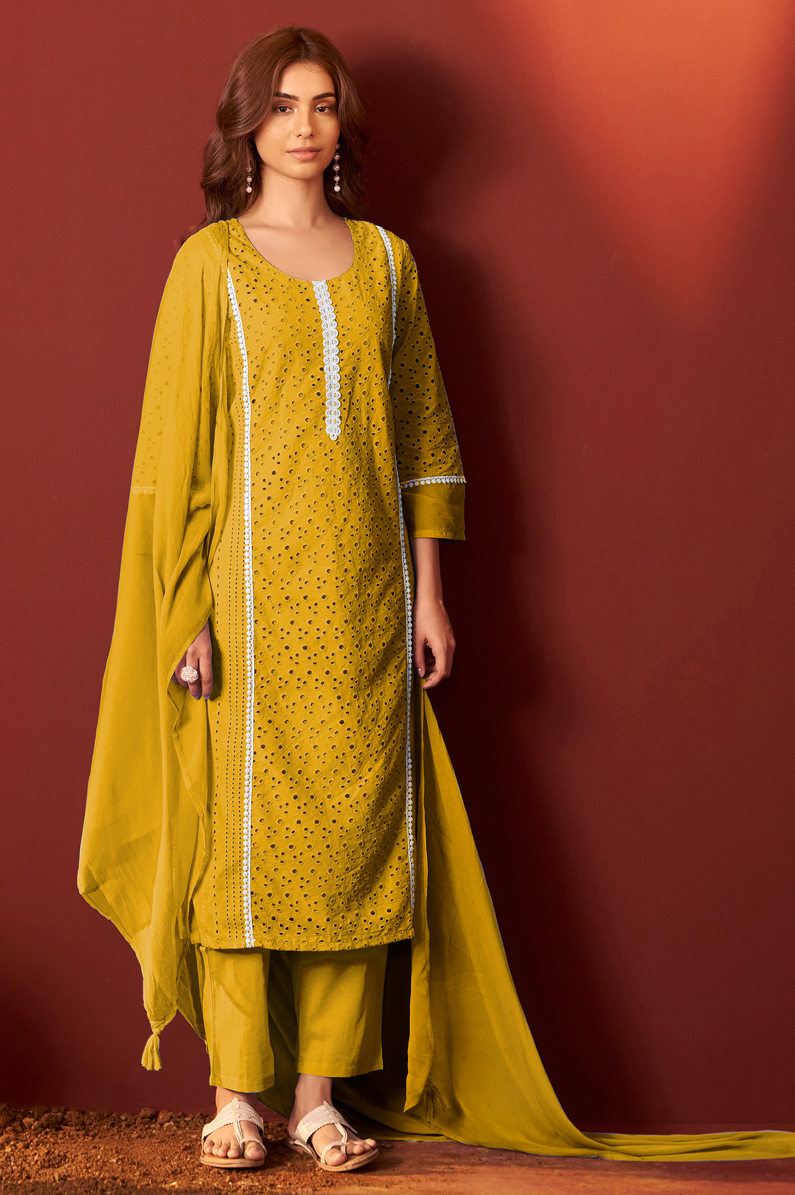 Mustard Pure Cotton Schiffly Kurta Set with Dupatta For Women