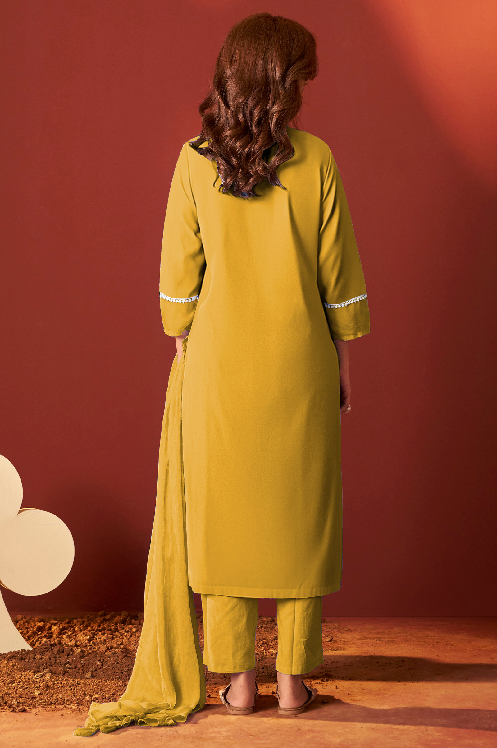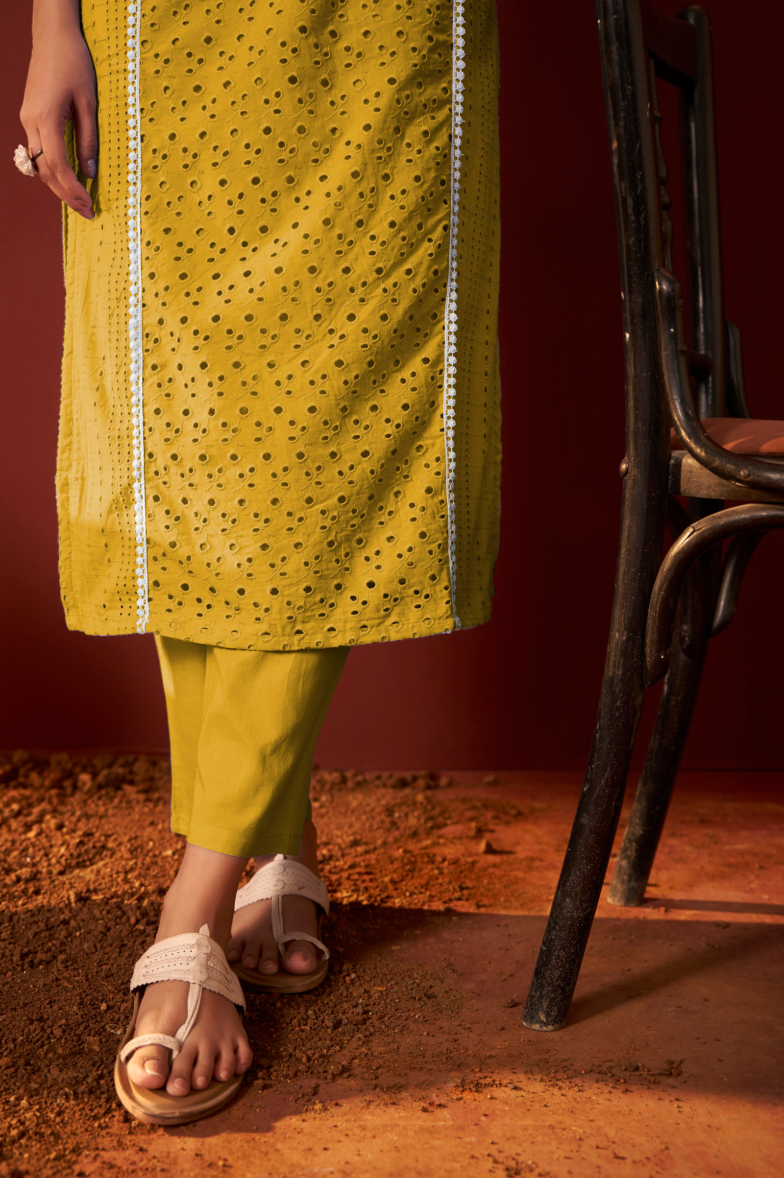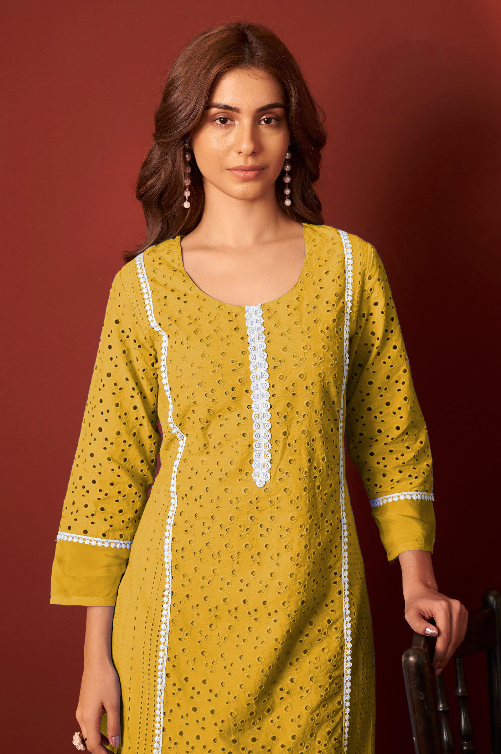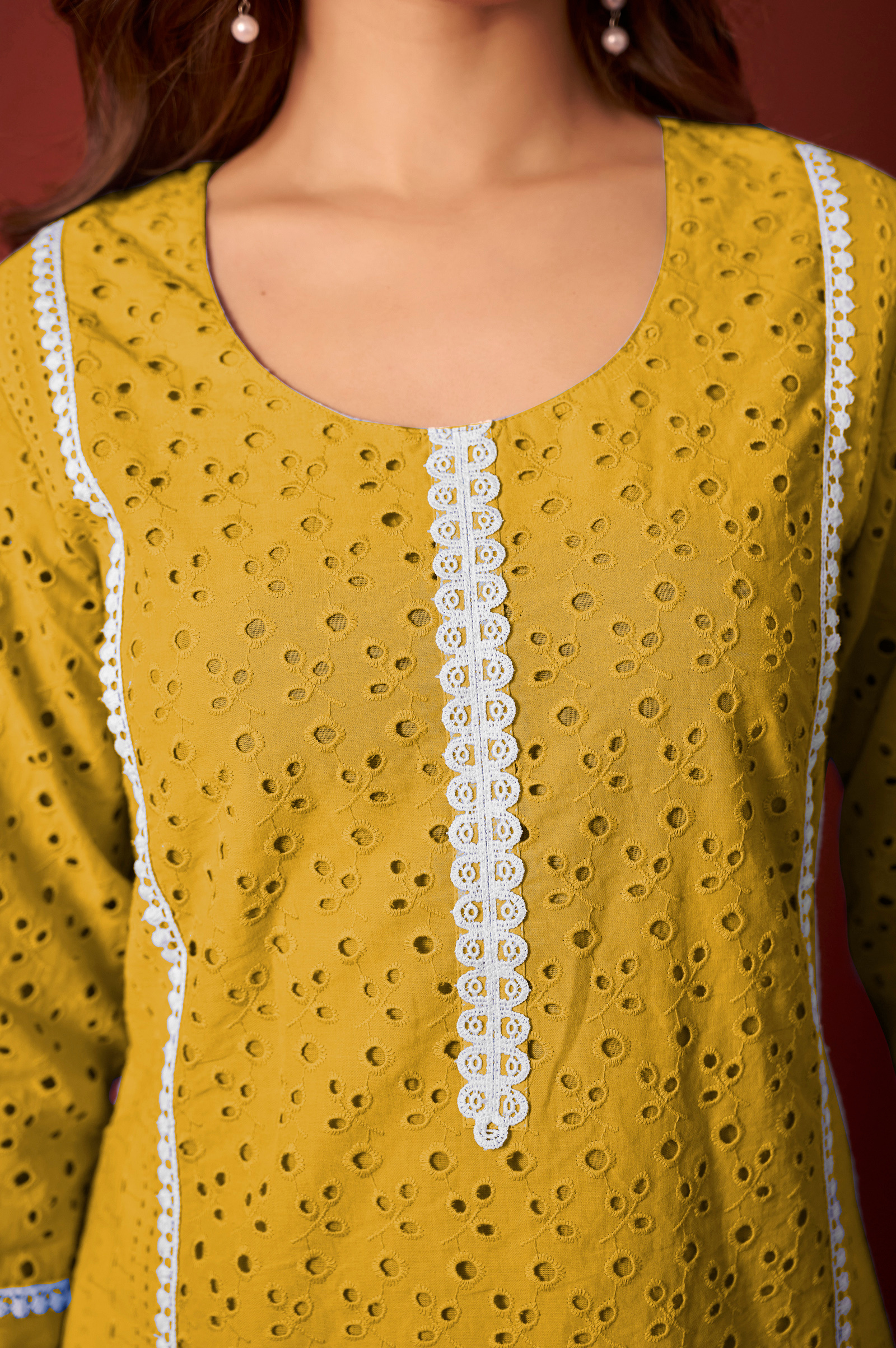 • This Mustard kurta set is crafted from pure cotton and features intricate Schiffly work throughout the front, enhanced with two delicate lace work lines that add an elegant touch.