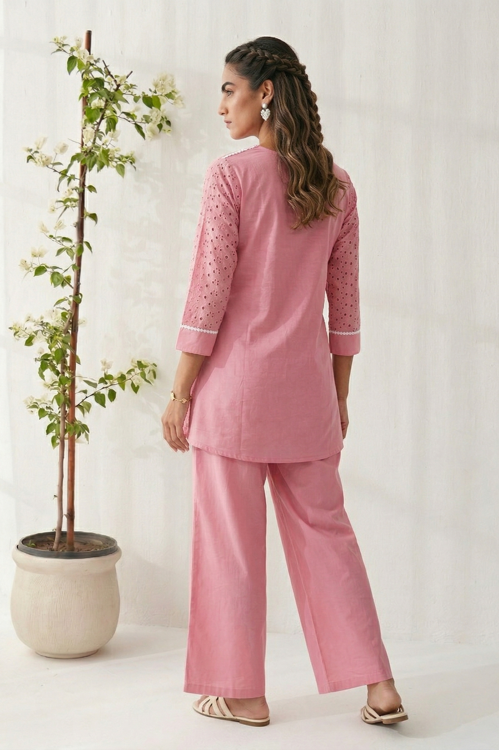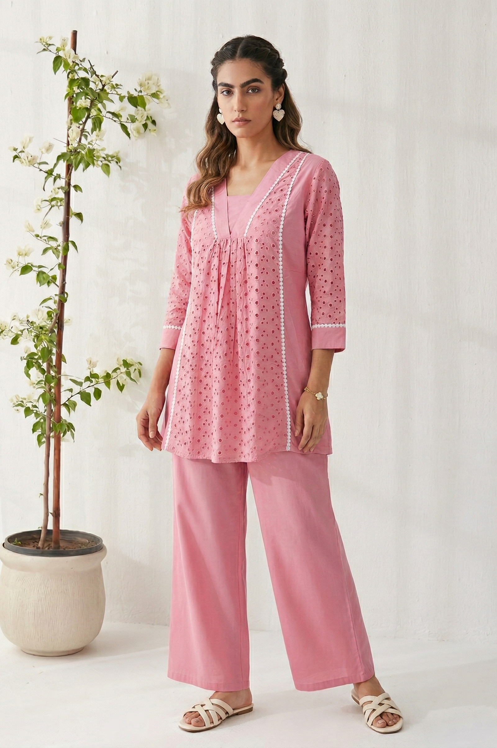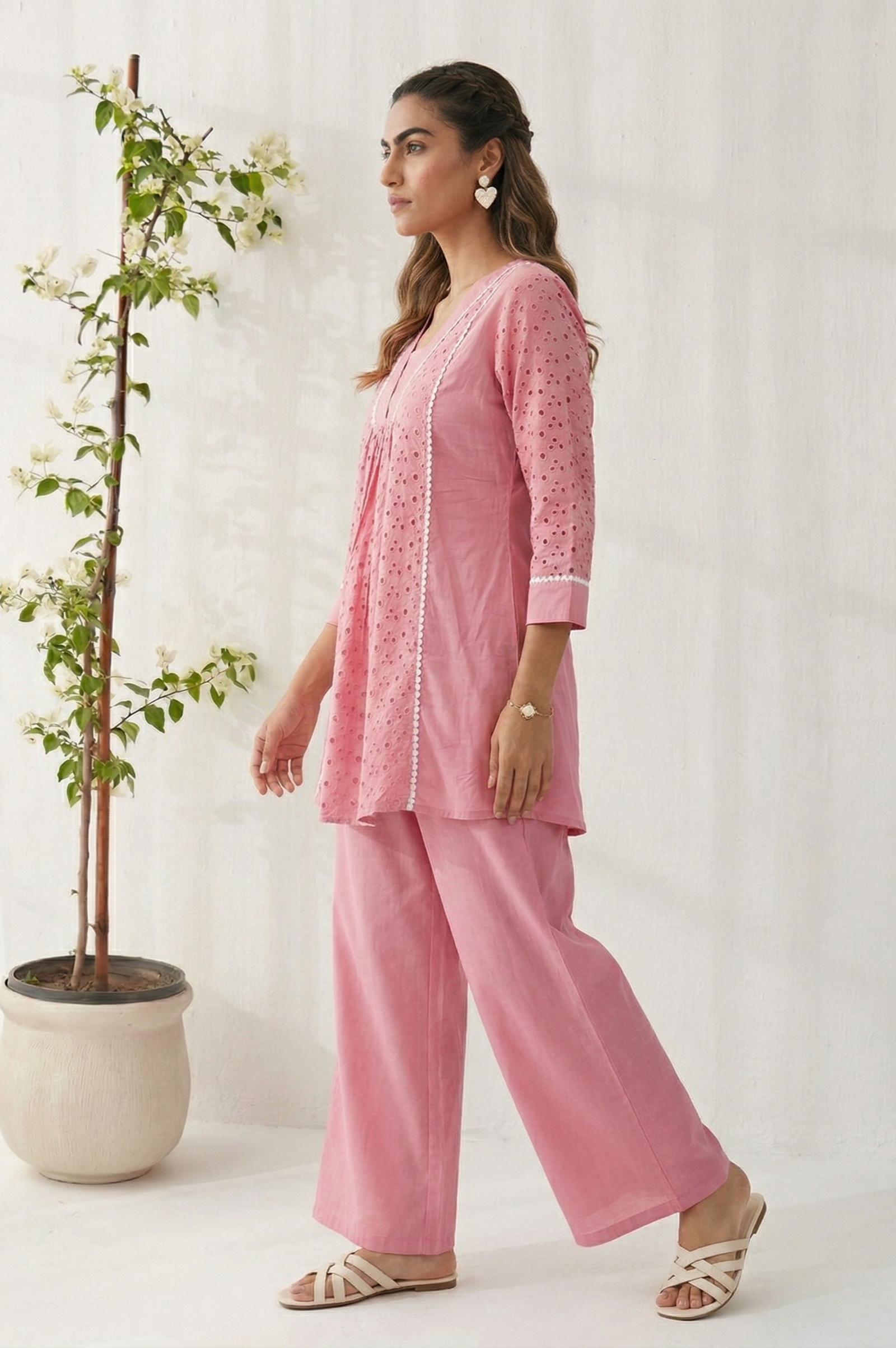 pink cotton schiffli co-ord set women, pure cotton embroidered co-ord set, schiffli kurta pant set, women summer cotton co-ord set, pink ethnic co-ord outfit, cotton embroidered kurta set, breathable cotton ethnic wear, fit and flare kurta set, daily wear cotton co-ord, casual ethnic wear women