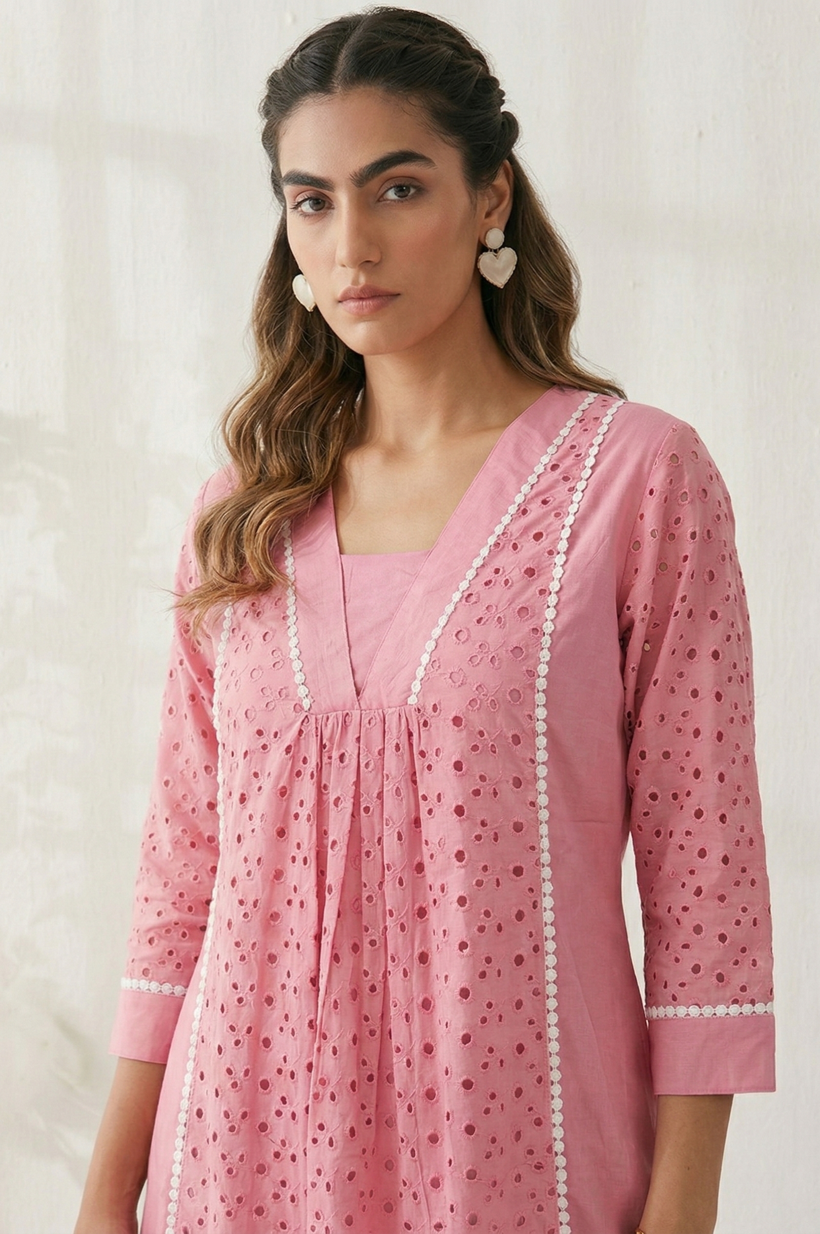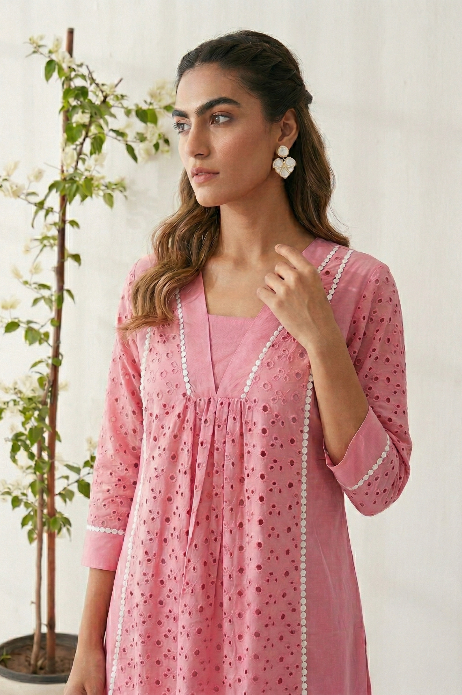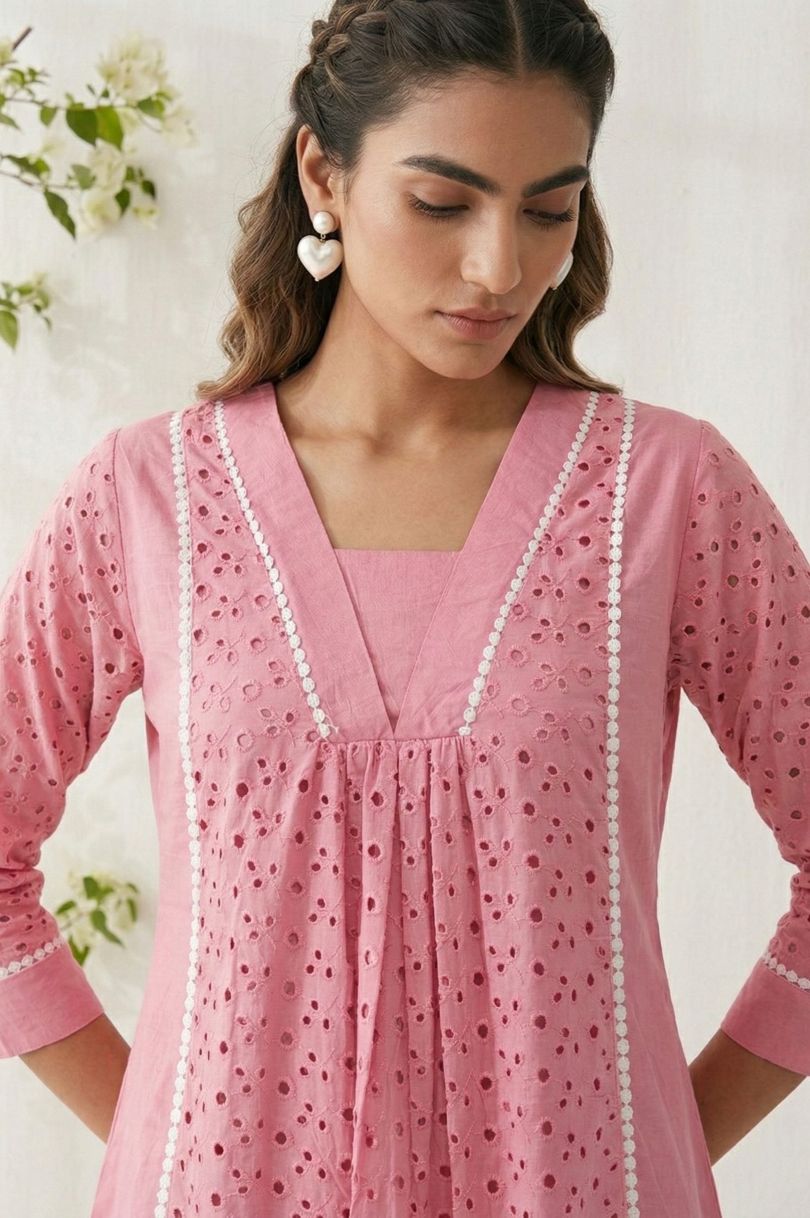 pink cotton schiffli co-ord set women, pure cotton embroidered co-ord set, schiffli kurta pant set, women summer cotton co-ord set, pink ethnic co-ord outfit, cotton embroidered kurta set, breathable cotton ethnic wear, fit and flare kurta set, daily wear cotton co-ord, casual ethnic wear women