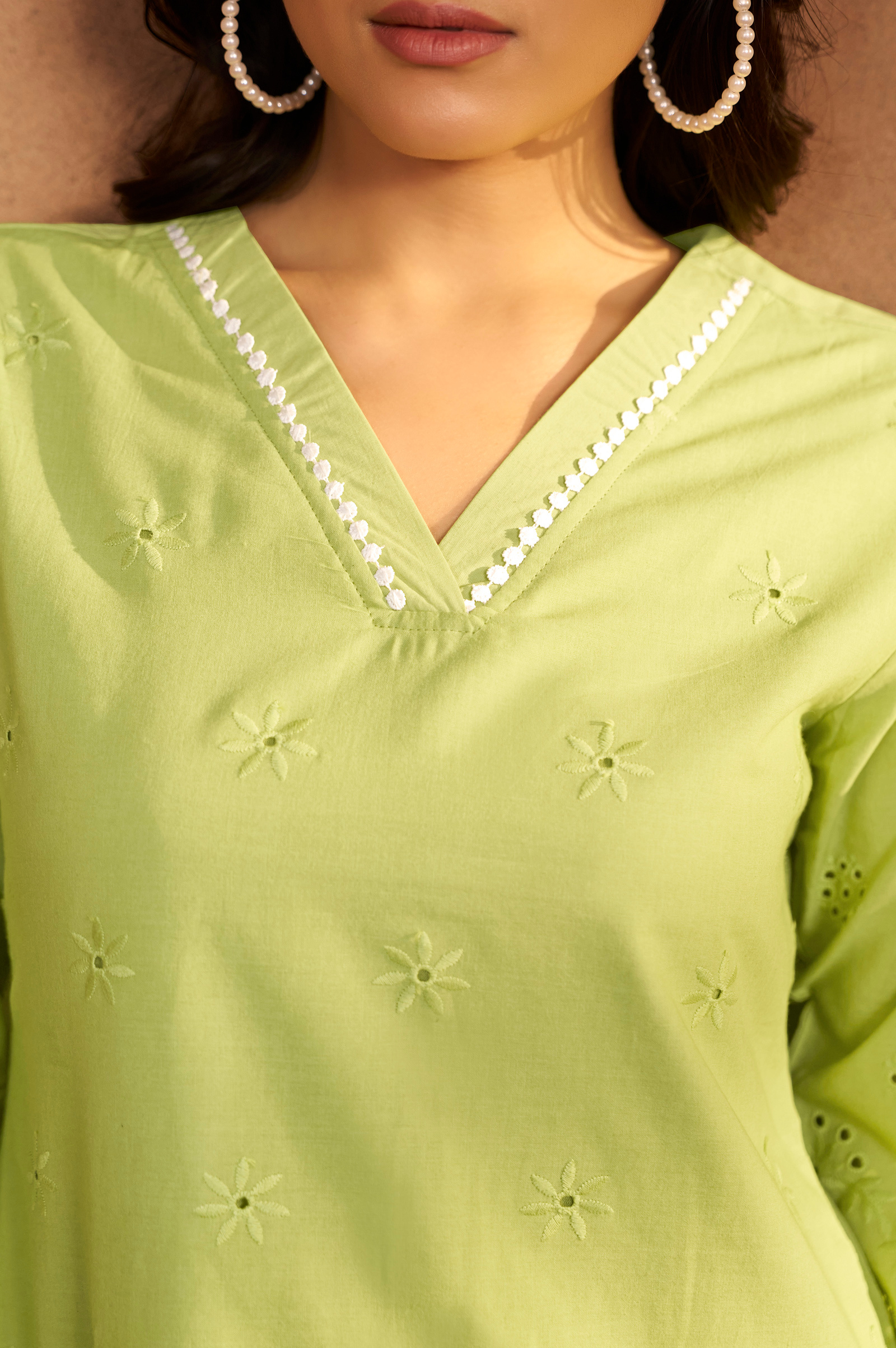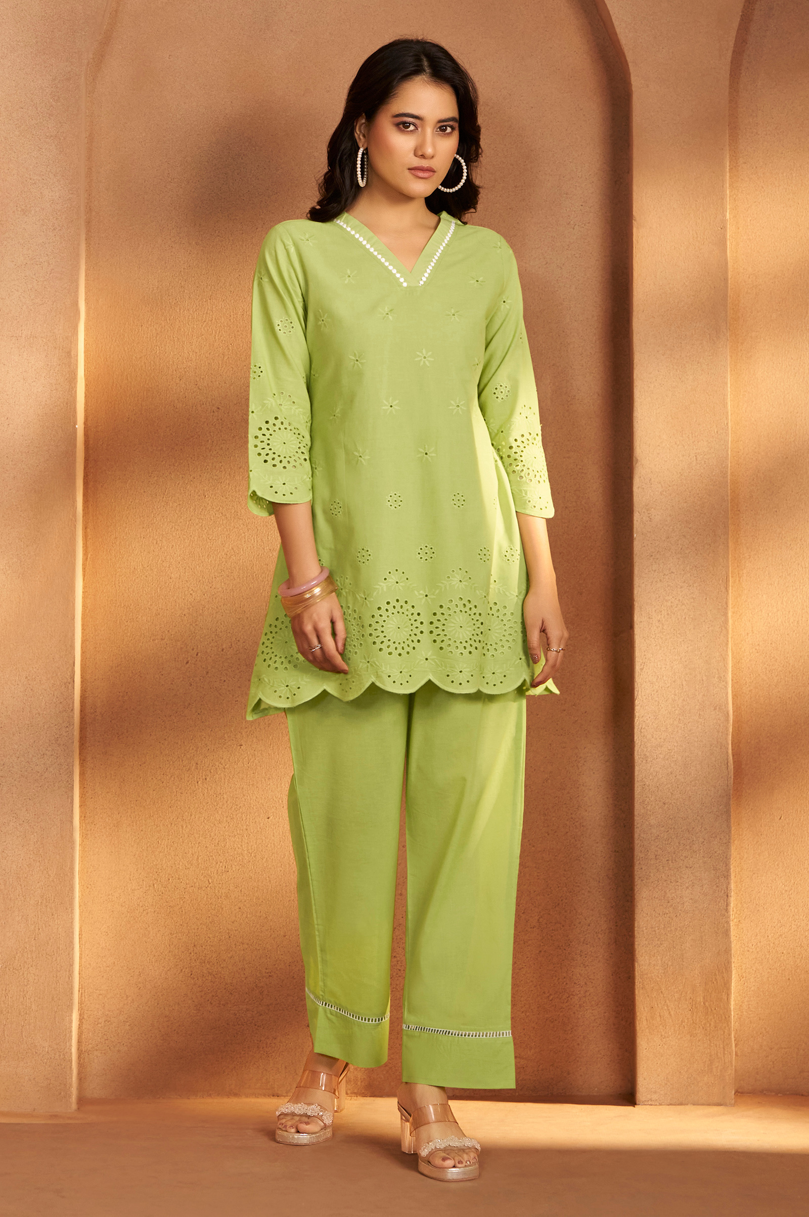 Enhance your festive-casual wardrobe with this elegant Green Pure Cotton Co-Ord Set, thoughtfully crafted for comfort and style. The set features a beautifully designed Schiffli-embroidered top with delicate lace detailing, giving it a premium and feminine look. Made from pure cotton, the top ensures breathability and all-day comfort, while the flattering V-Neck, 3/4th Regular Sleeves, and Hip-Length Straight silhouette create a polished appearance.