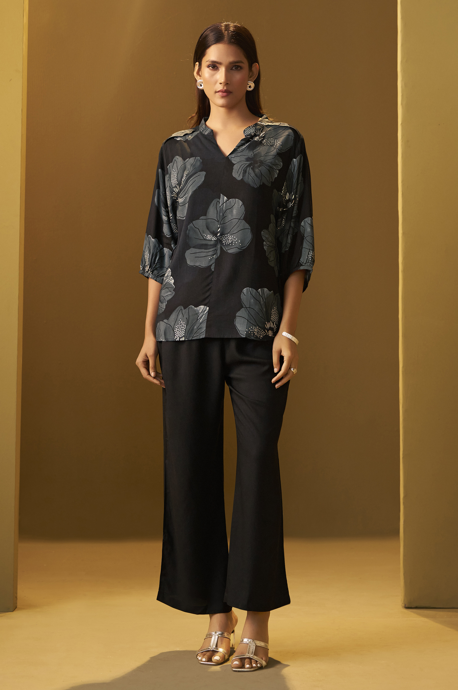 Our Black floral print Viscose Reyon Mill foil top, a captivating symphony of colors reminiscent of blooming flowers during festive seasons, is a testament to the rich cultural heritage of the region. The loose fit of the top allows for comfort without compromising on style, while gathers on the sleeves add a touch of grace that resonates with traditional aesthetics.