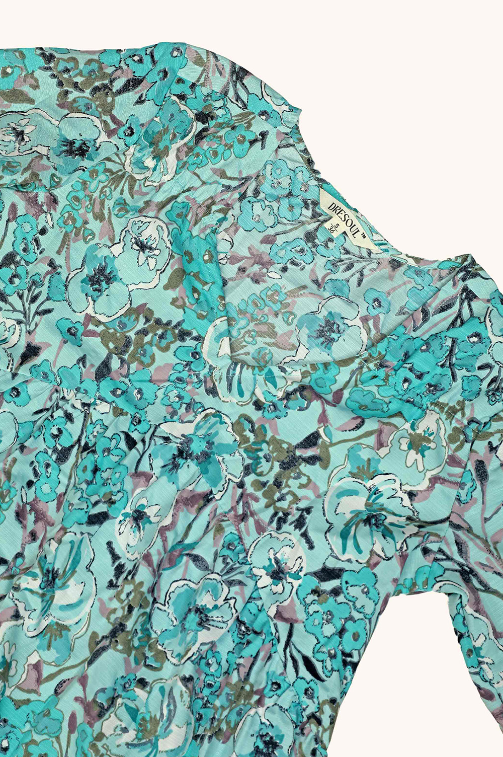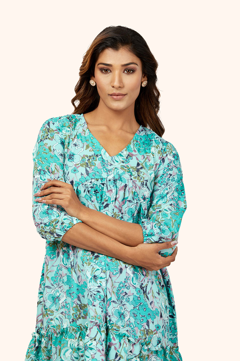 A polyester mini blue floral dress with a flattering V-neck and elbow-length sleeves, featuring a gorgeous gather pattern, is the perfect addition to your wardrobe.