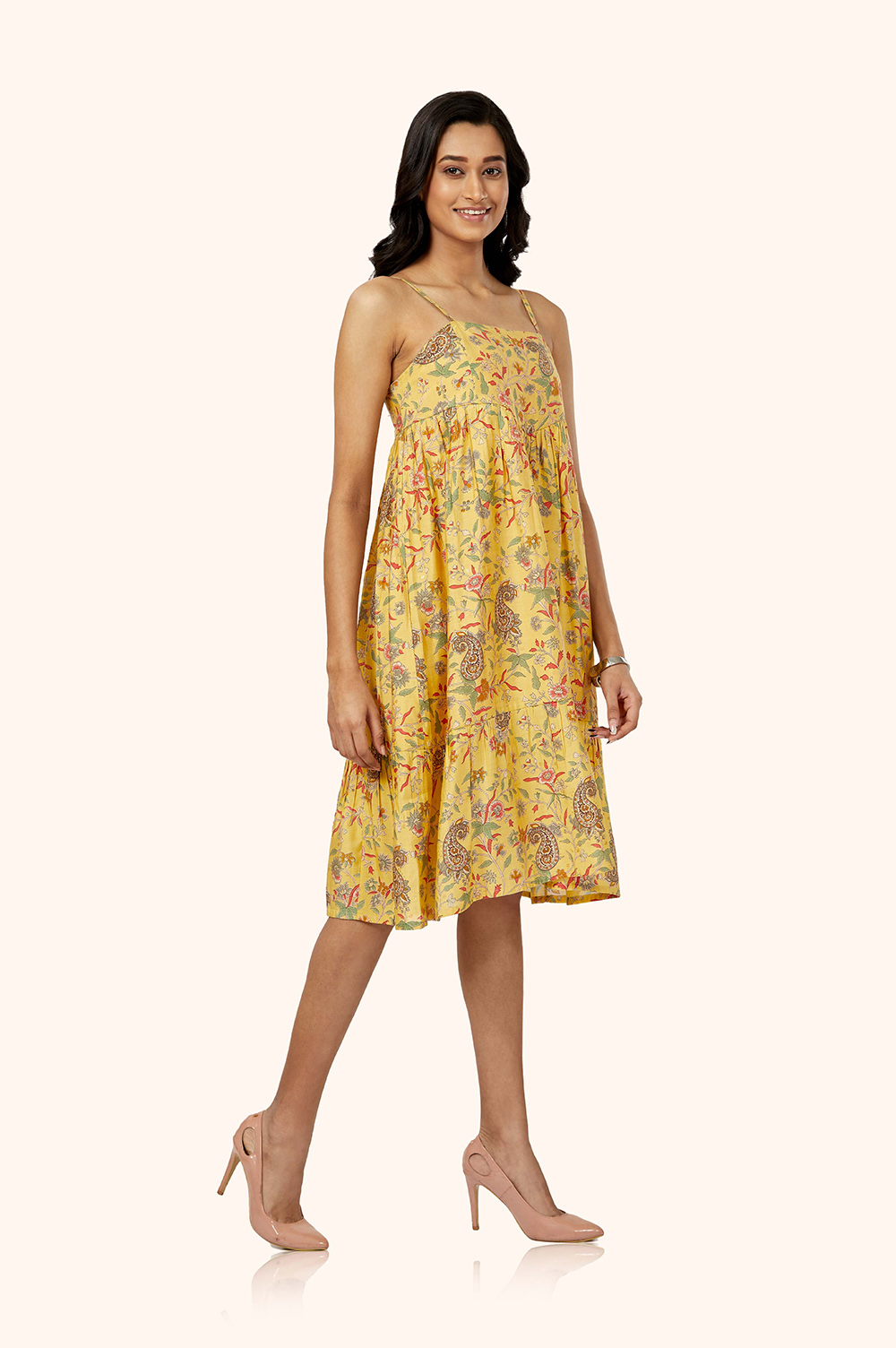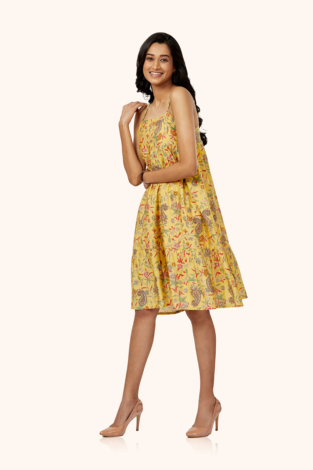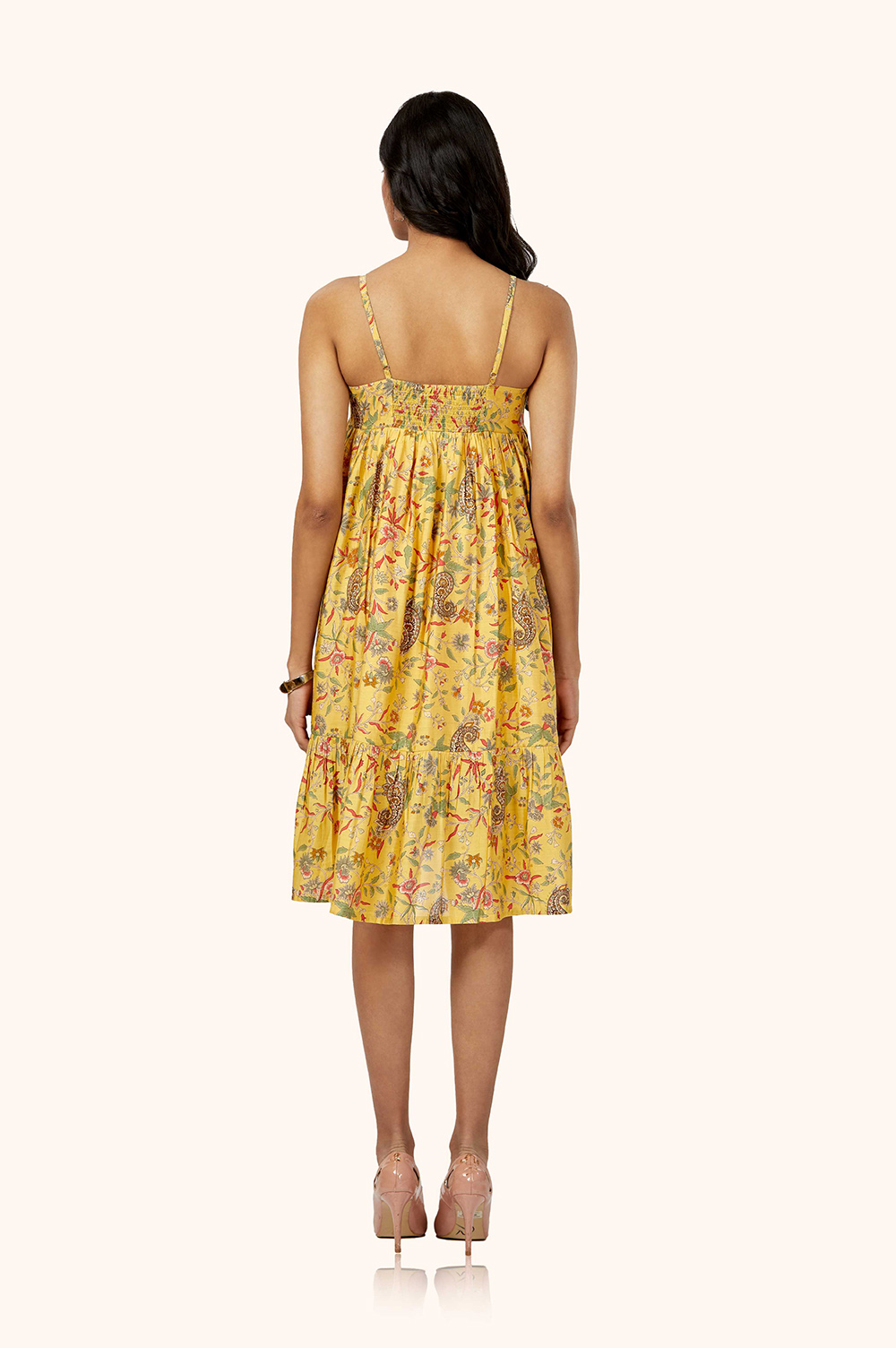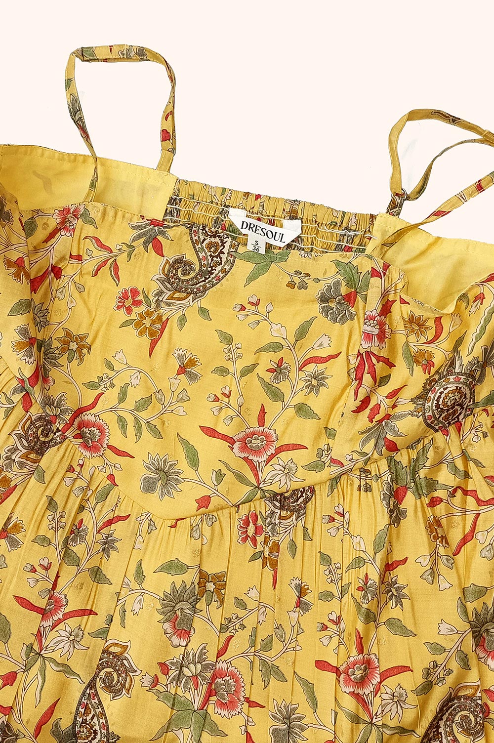 The delicate noodle straps have a unique backside smoking pattern, which adds a touch of femininity, while the gathered waist creates a flattering silhouette.