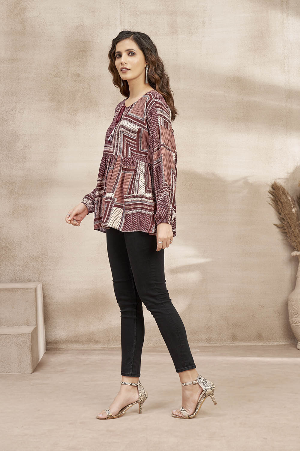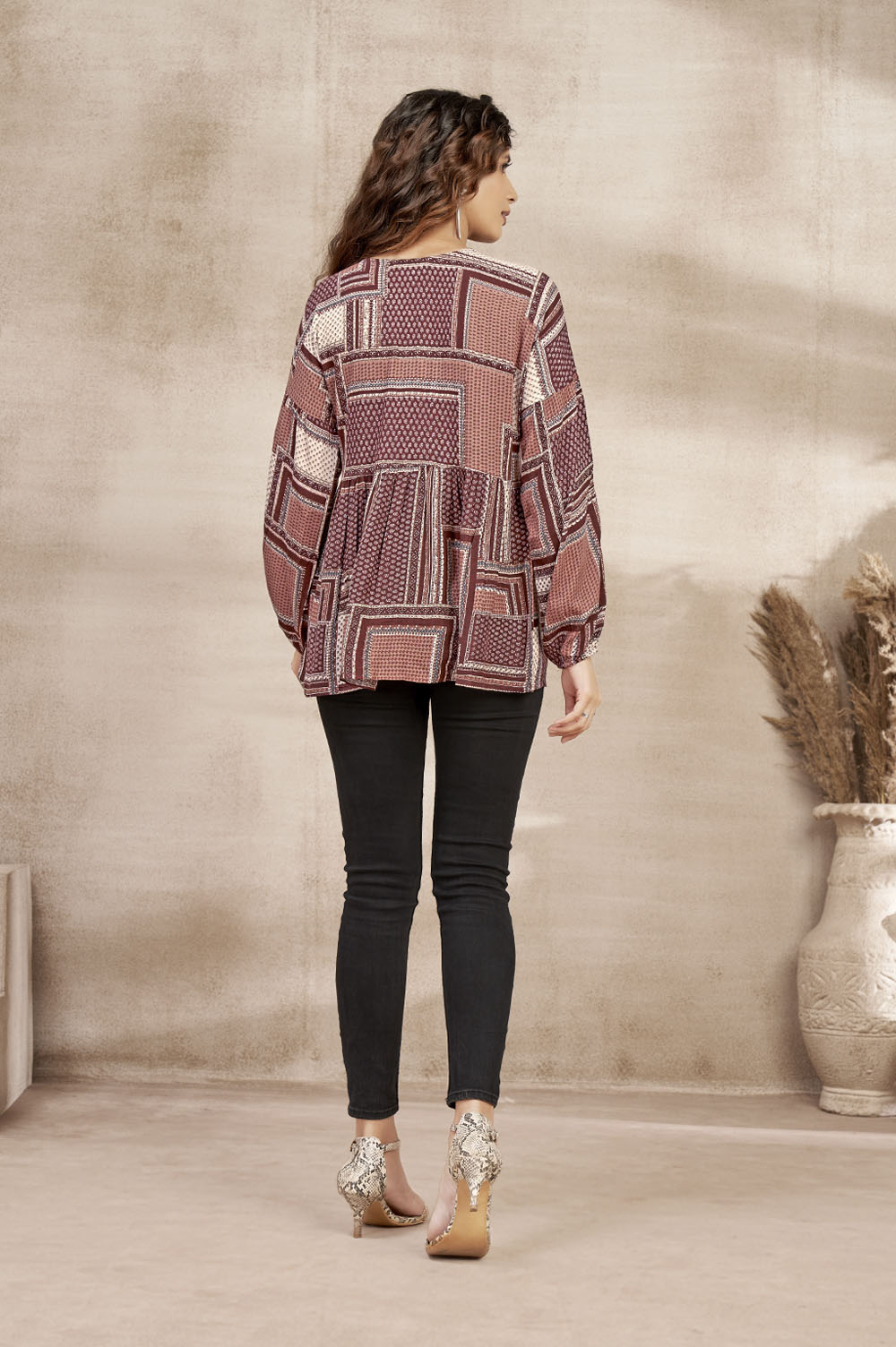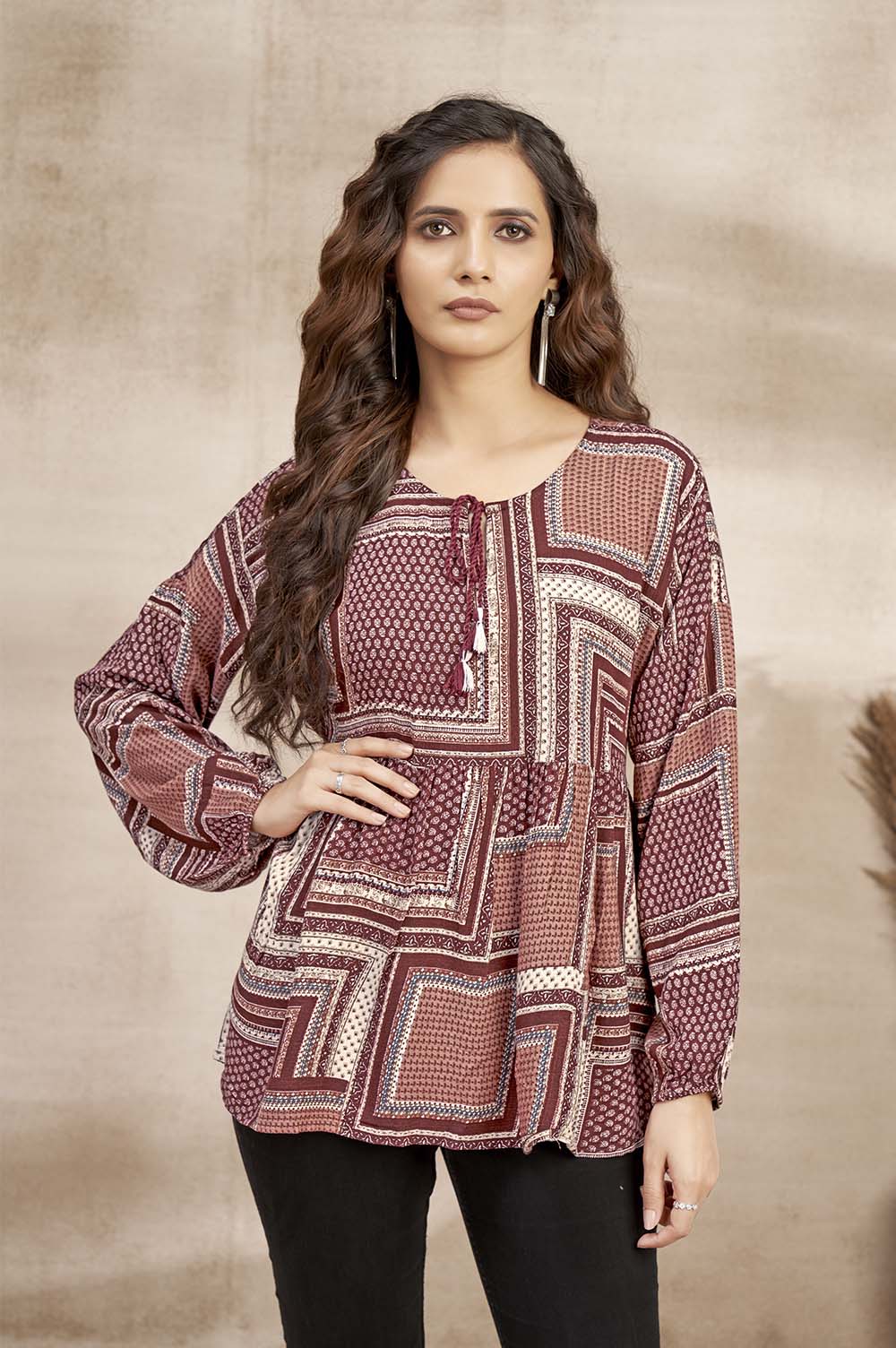 Introducing the breathtakingly beautiful Earthy Hued Rayon Top, delicately flared with a Tie Thread Pattern at the neck. This charming and elegant top features an exquisite blend of contemporary design and natural textures, creating a luxurious and sophisticated ensemble fit for any occasion.