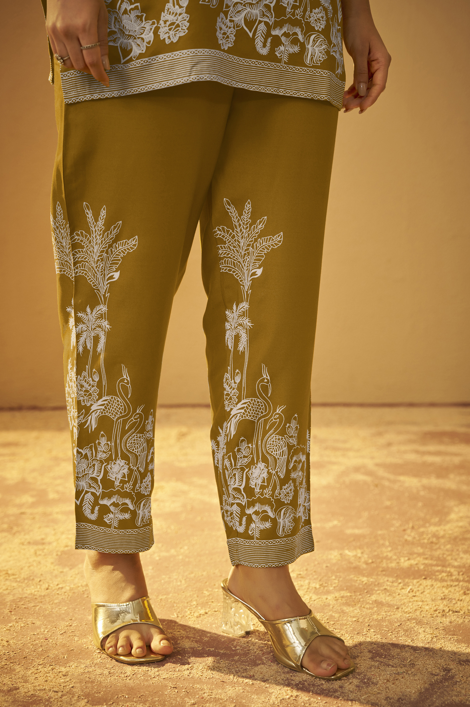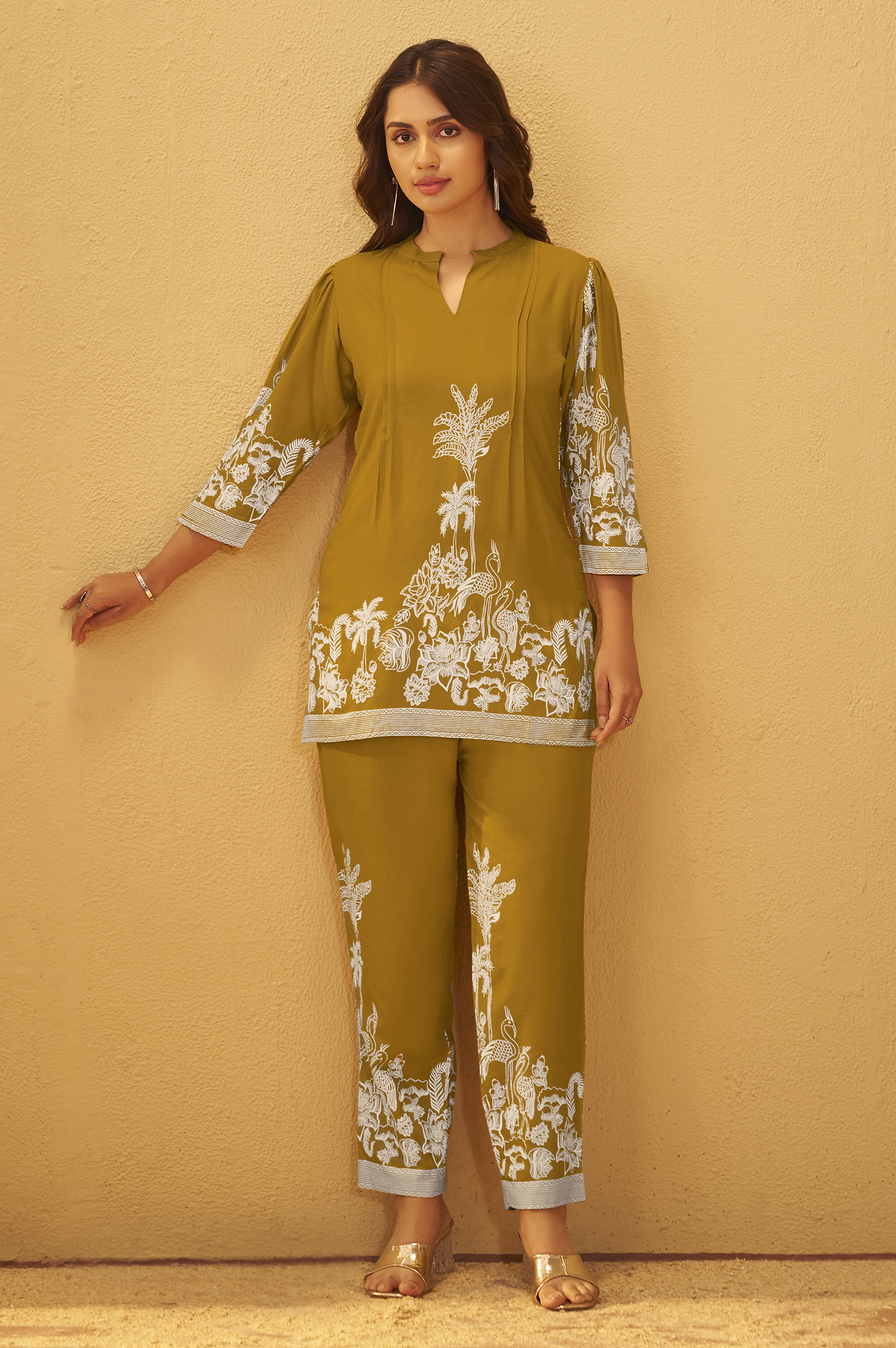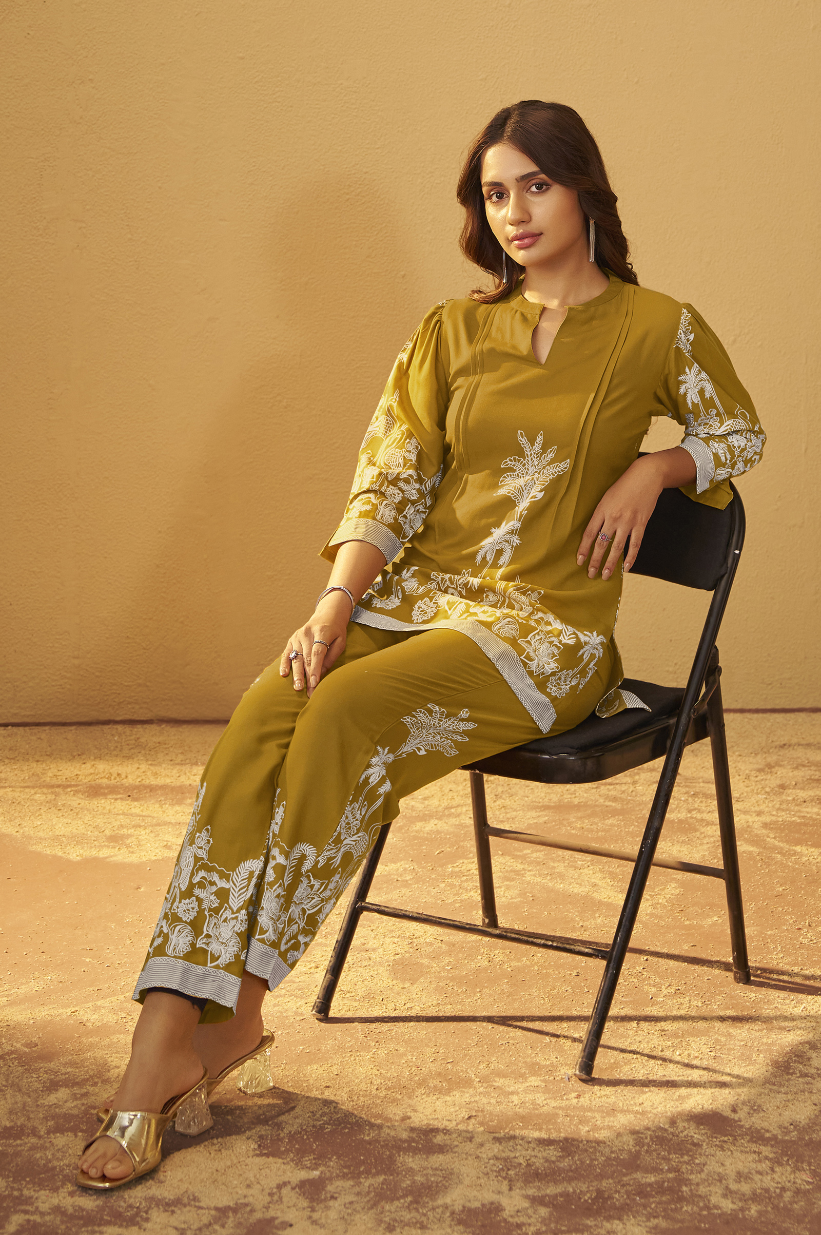 The bottom is made from rayon fabric, offering a soft and breathable feel, perfect for all-day comfort. Featuring a delicate floral print on an elegant Mustard base, it blends effortless style with ease, making it a versatile choice for both casual and semi-formal occasions.