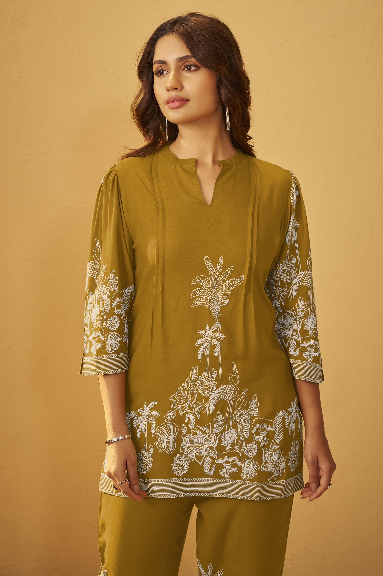 This top is crafted from rayon, featuring a soft floral print on an elegant mustard base. Its breathable and lightweight fabric ensures all-day comfort, while the delicate print adds a touch of femininity, making it a perfect choice for casual outings or relaxed everyday wear.