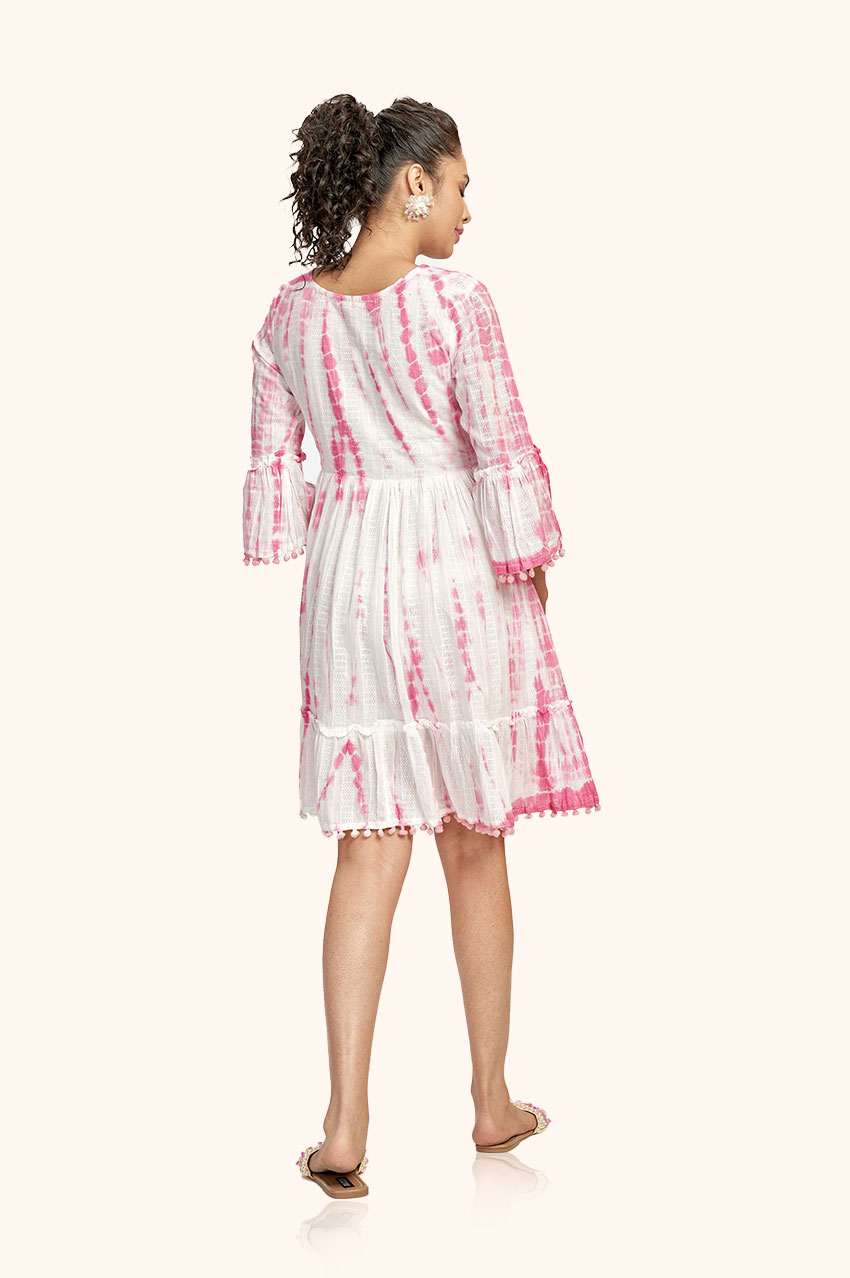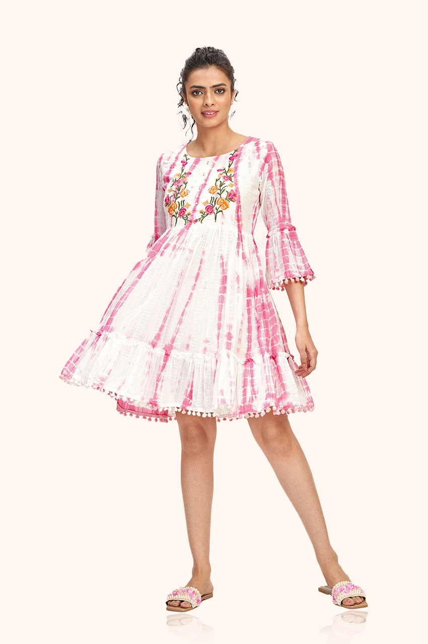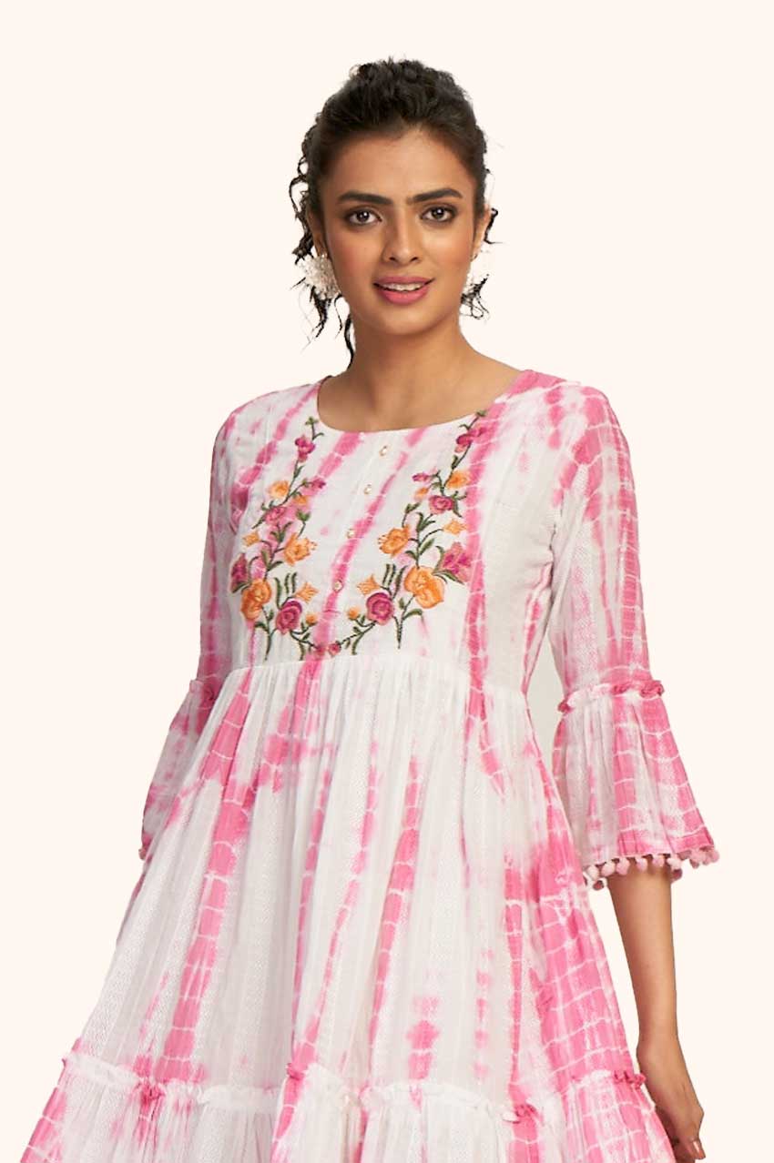 This beautiful midi dress features a stunning combination of white and pink with a shaded flare A-line design. The three-quarter bell sleeves are perfect for any weather, and the round neck with dori and tassels adds a touch of elegance. The gathers and knee-length hemline make it an apt choice for any body type.