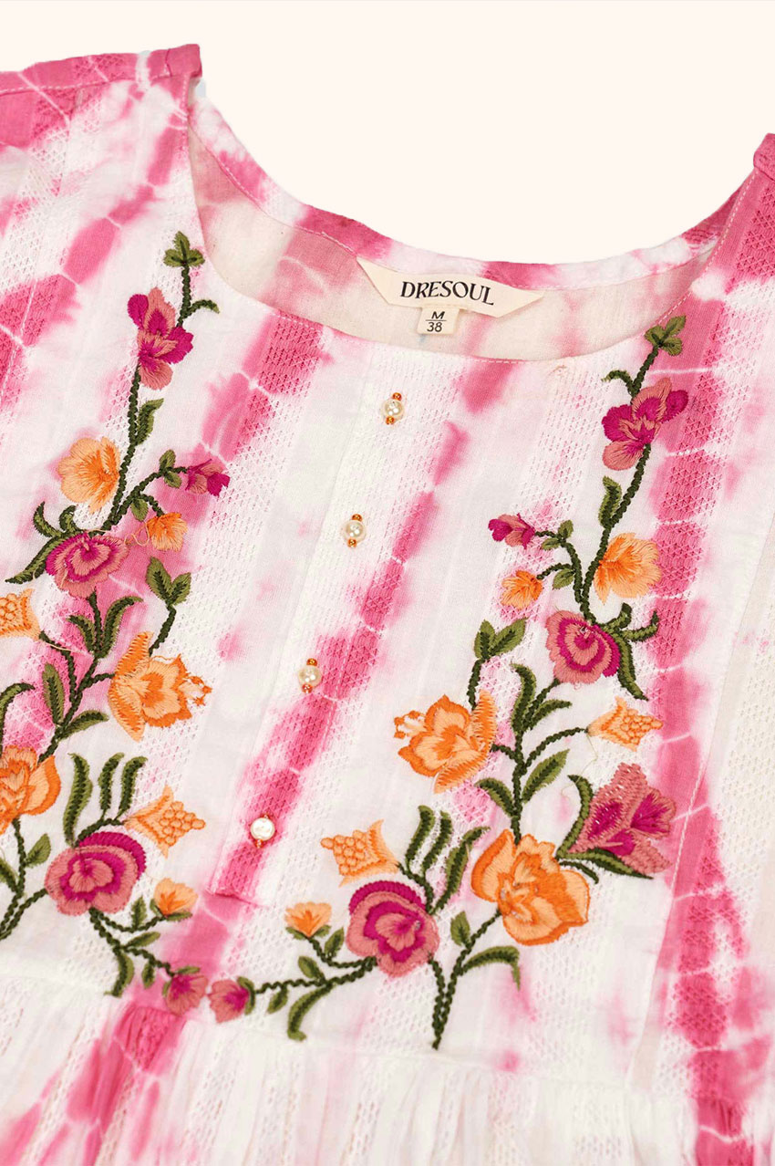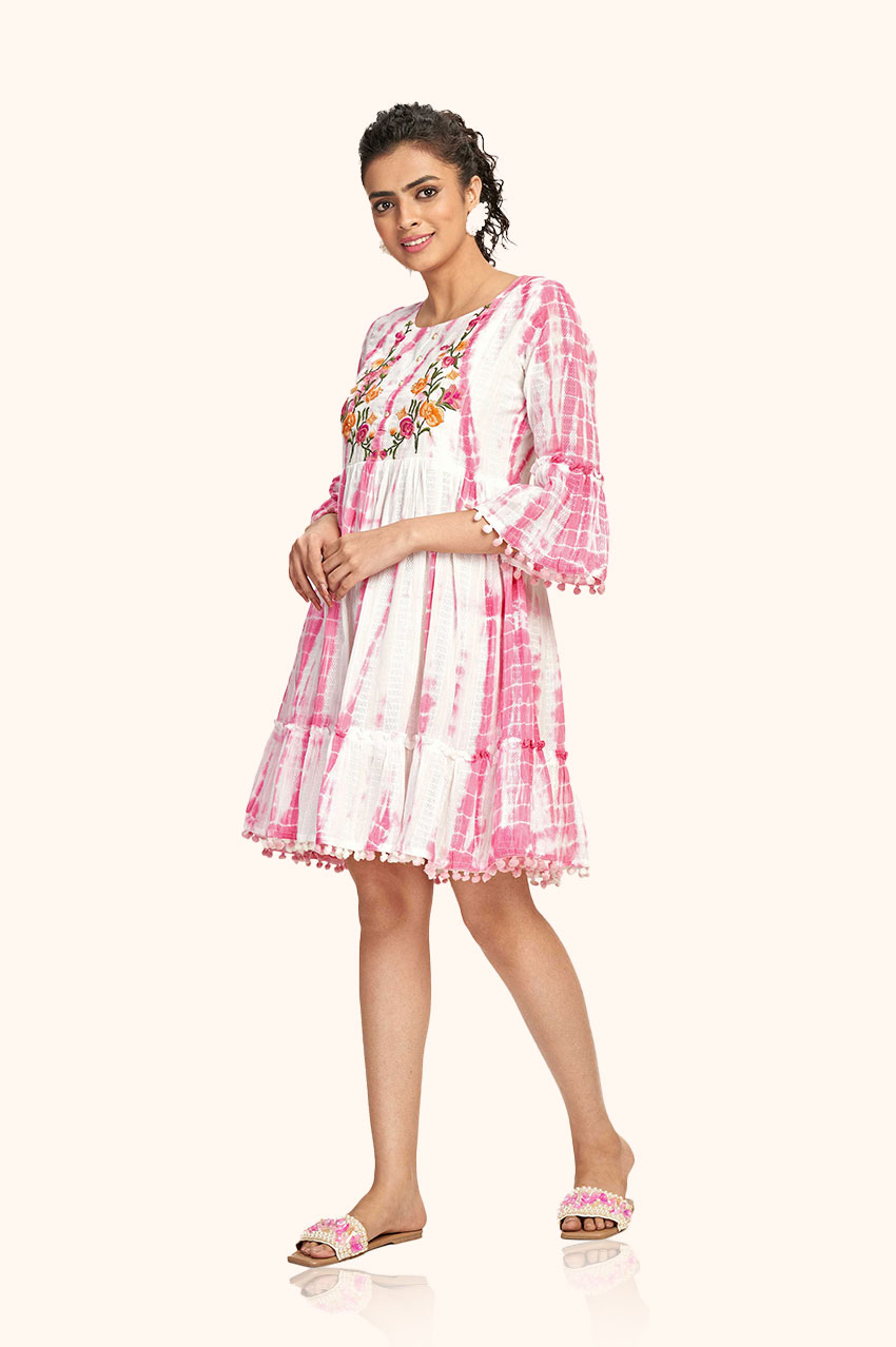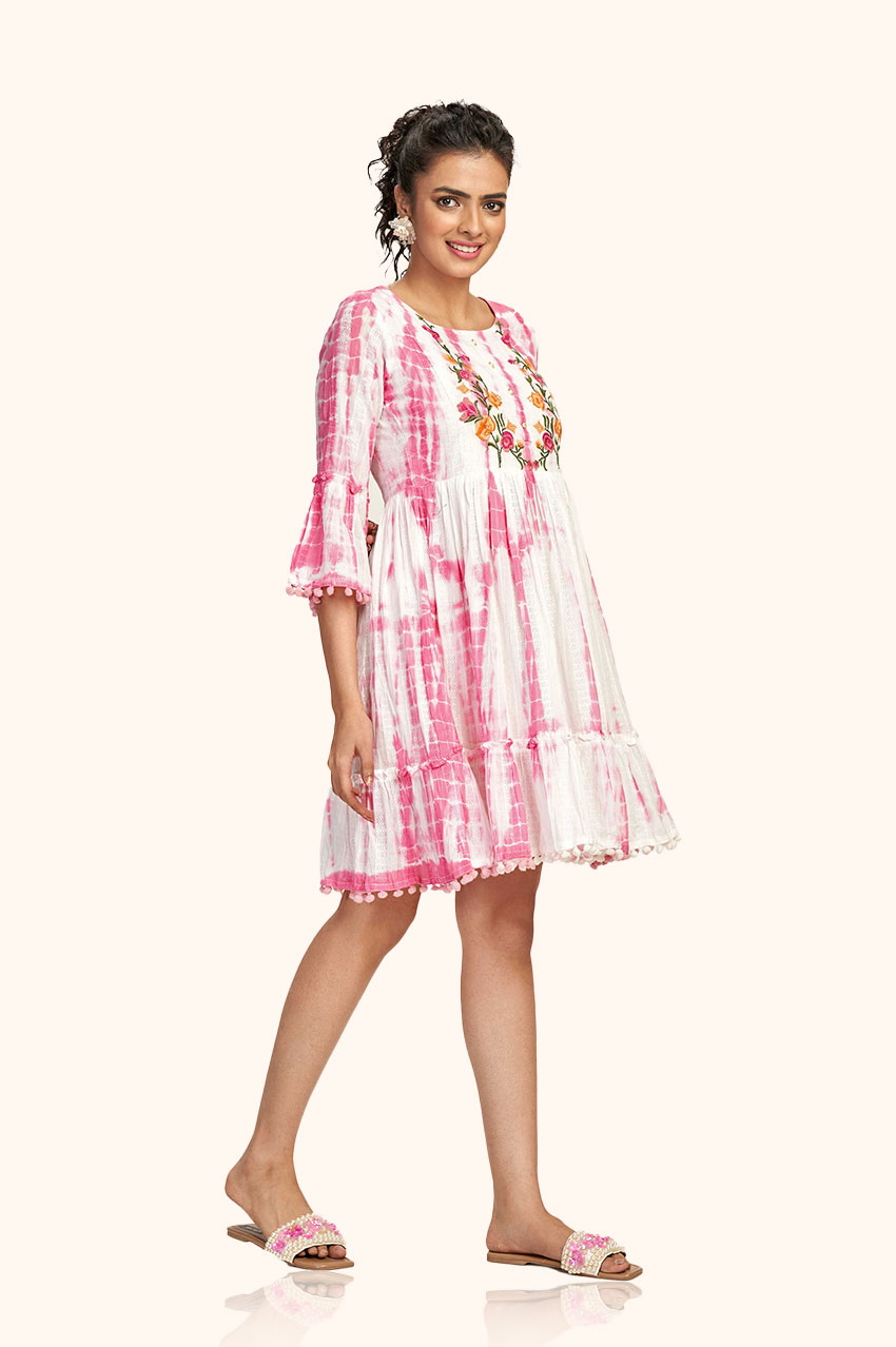 This beautiful midi dress features a stunning combination of white and pink with a shaded flare A-line design. The three-quarter bell sleeves are perfect for any weather, and the round neck with dori and tassels adds a touch of elegance. The gathers and knee-length hemline make it an apt choice for any body type.