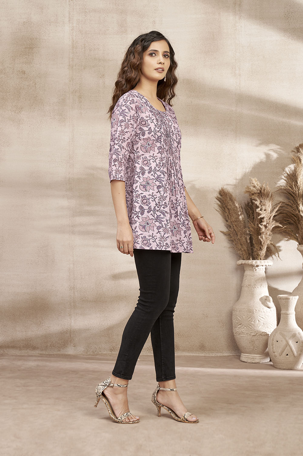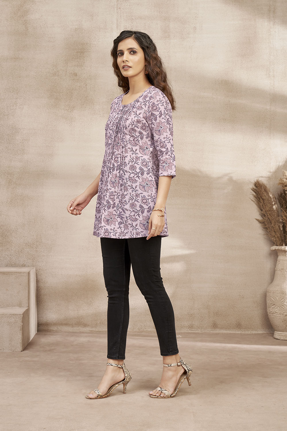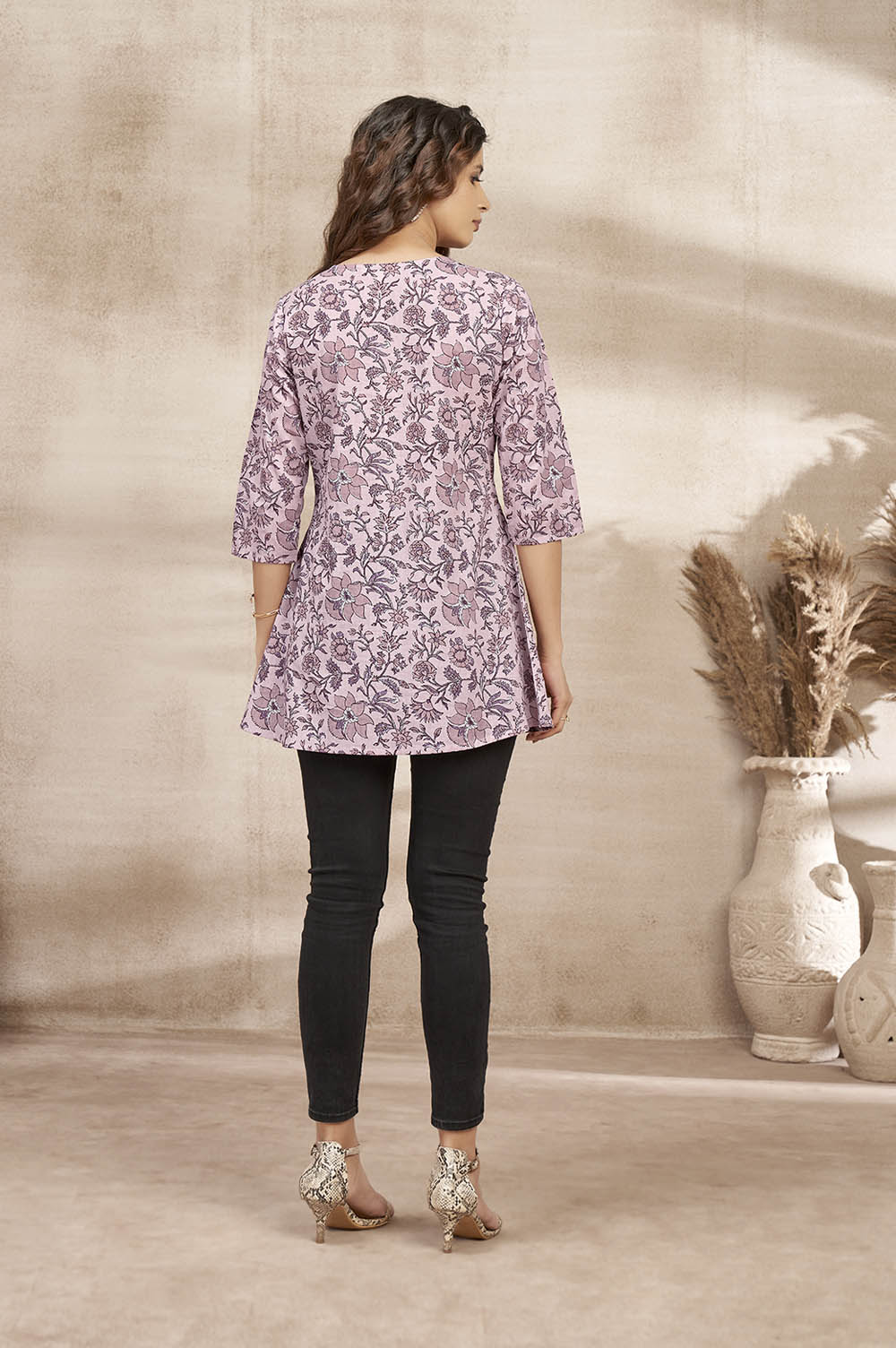 The Purple floral print adds a touch of femininity and sophistication, while the versatile color pairs well with a variety of accessories and outfits. Dress it up with a skirt or pair it with jeans for a more casual look.