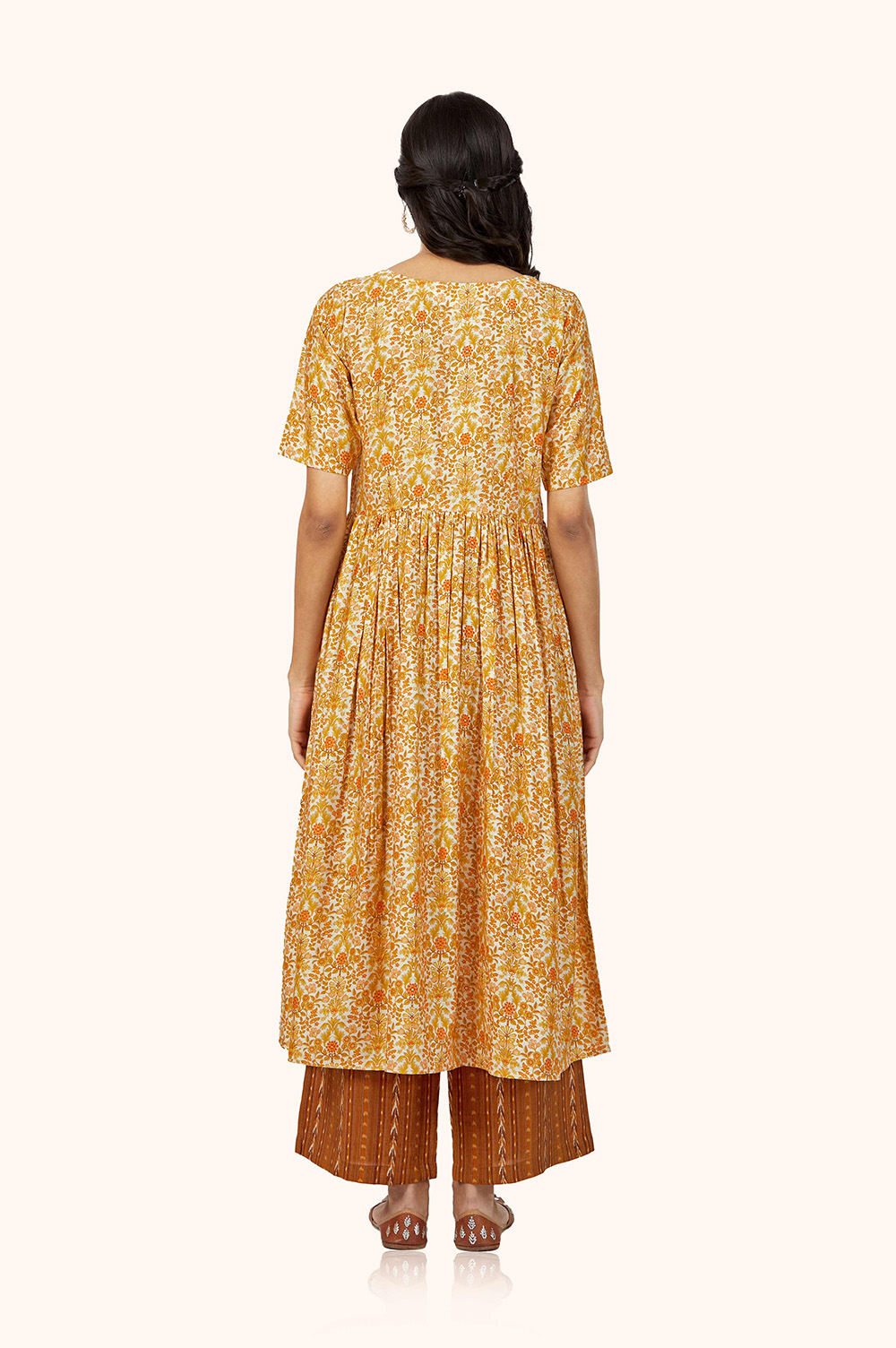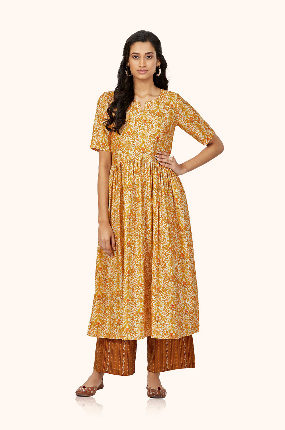 • The kurta is designed with gathers from the waist, giving it a flowy anarkali look that adds a touch of elegance to the outfit. The kurta also features elbow sleeves and a round V neck, making it perfect for any occasion.