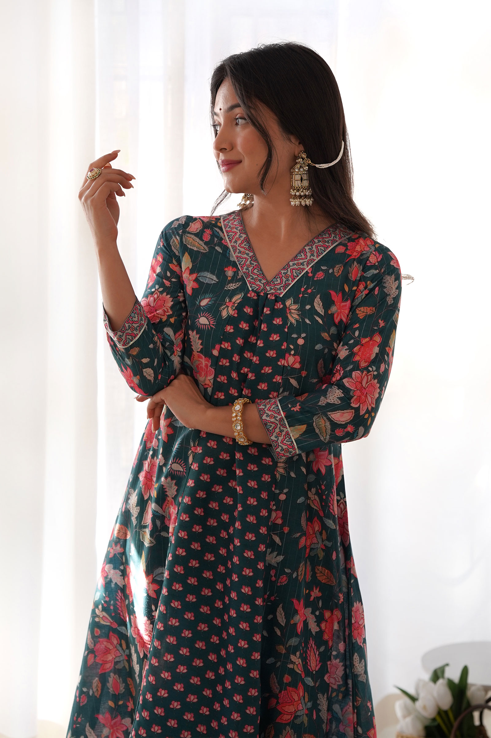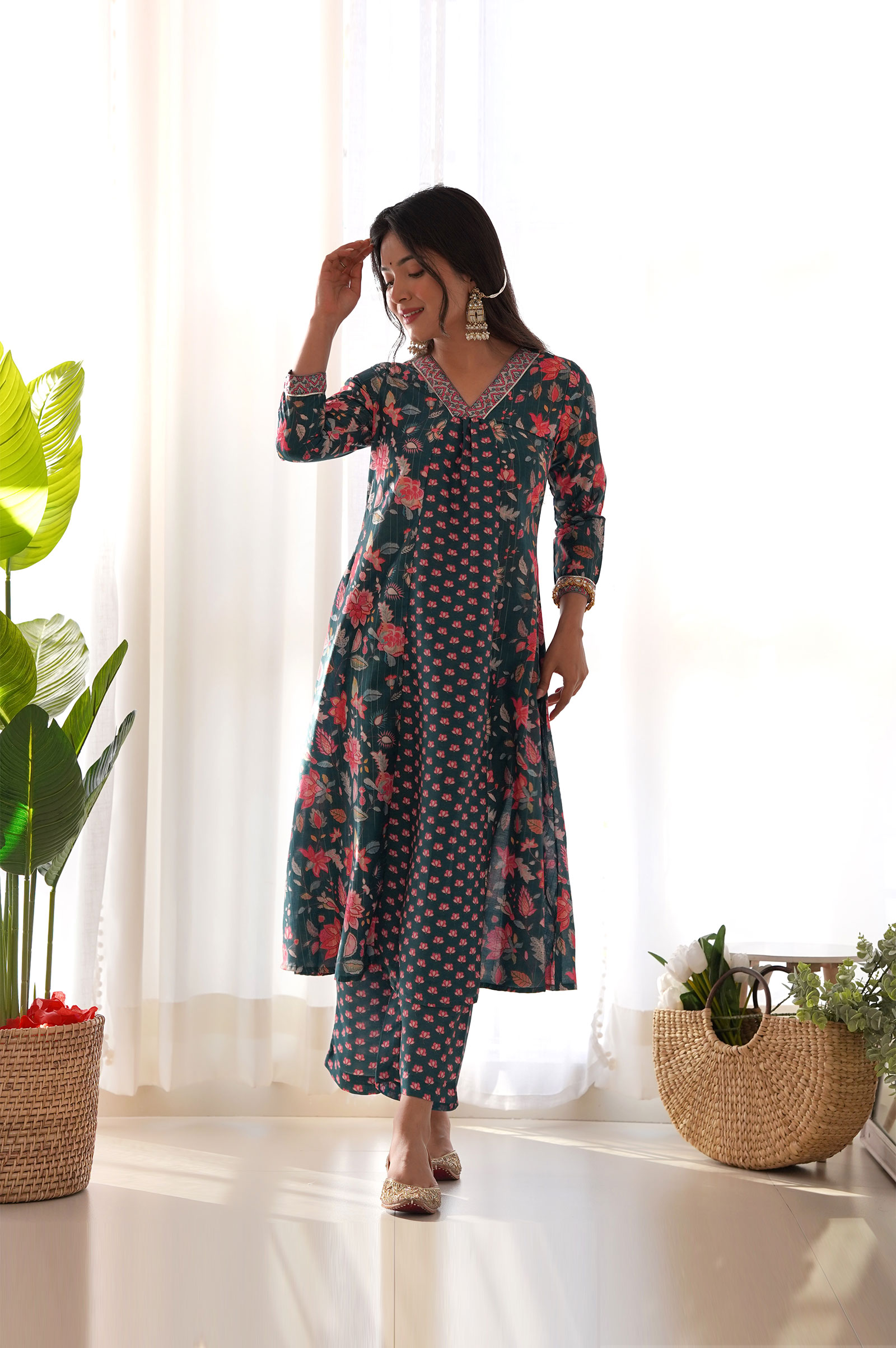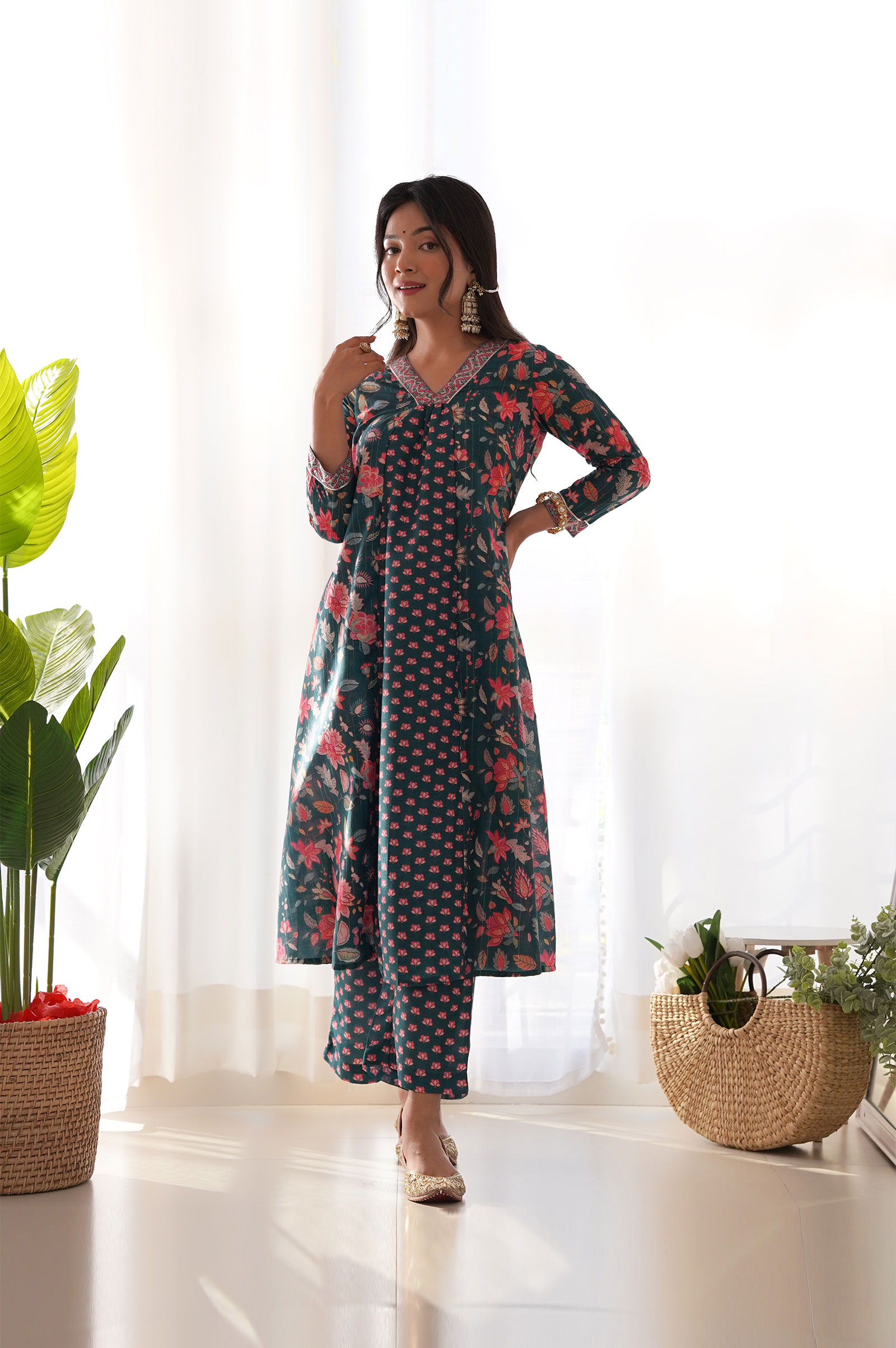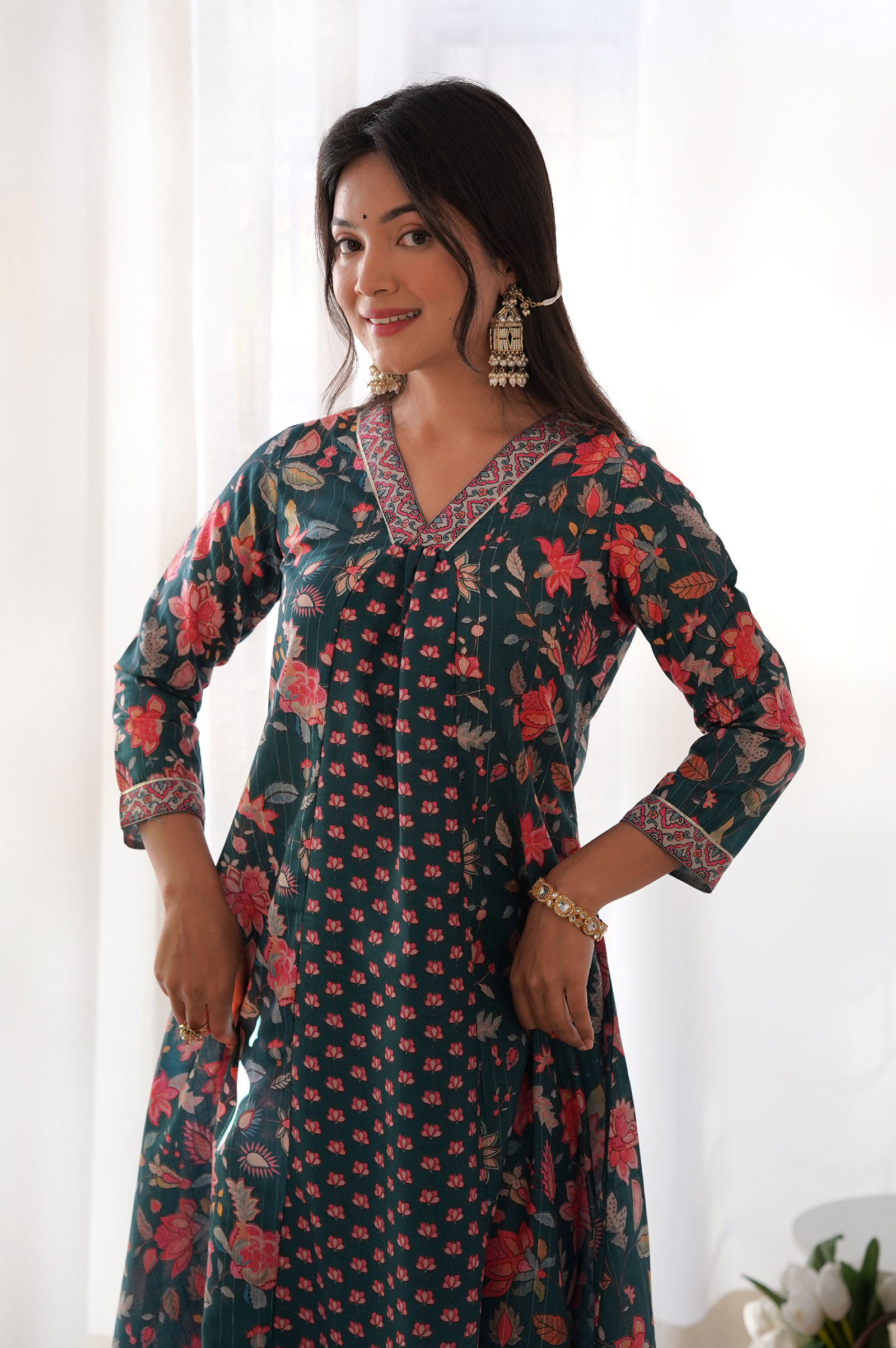 Teal Blue Digital Floral Print Panelled Kurta and Palazzo Set