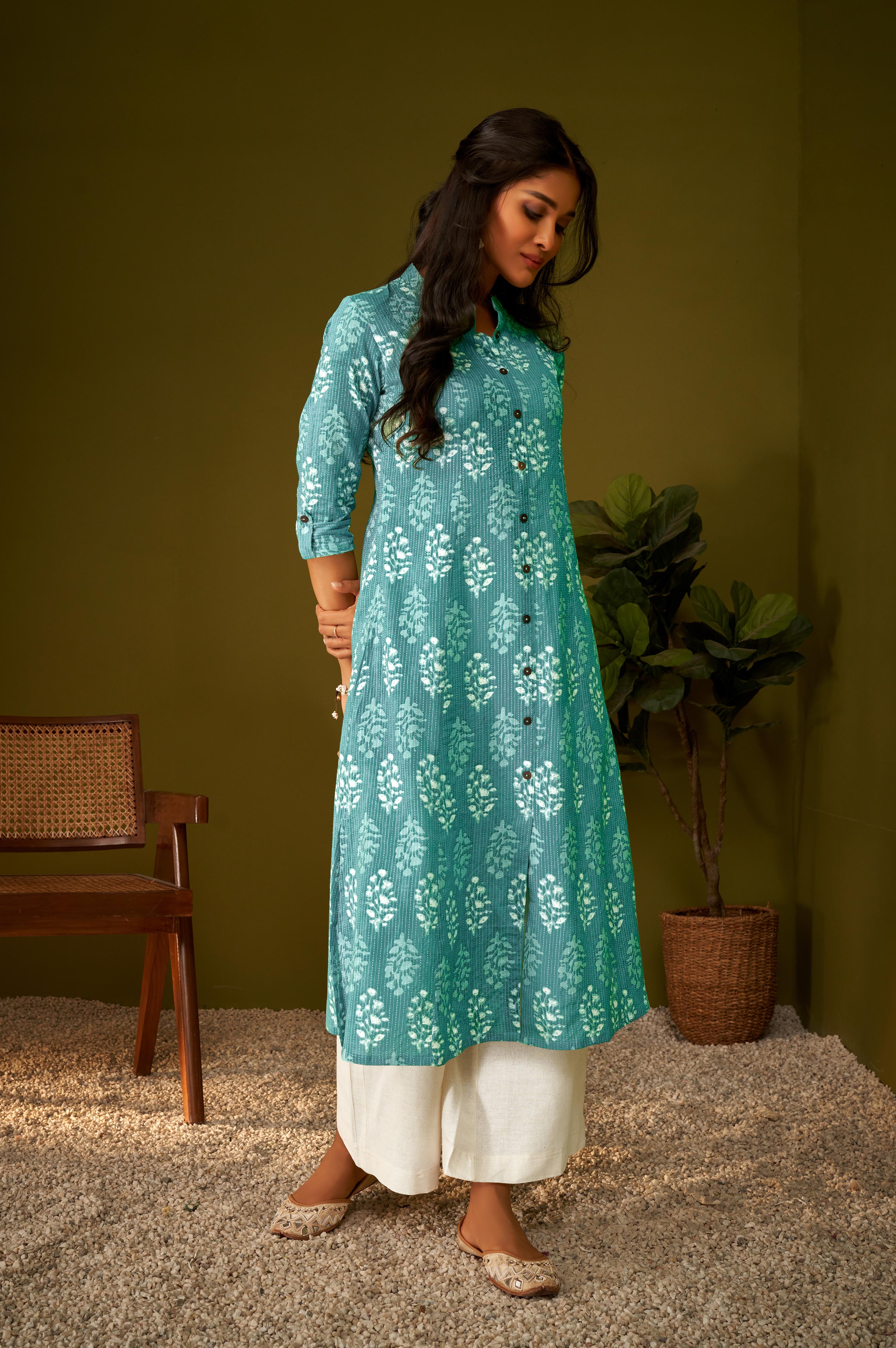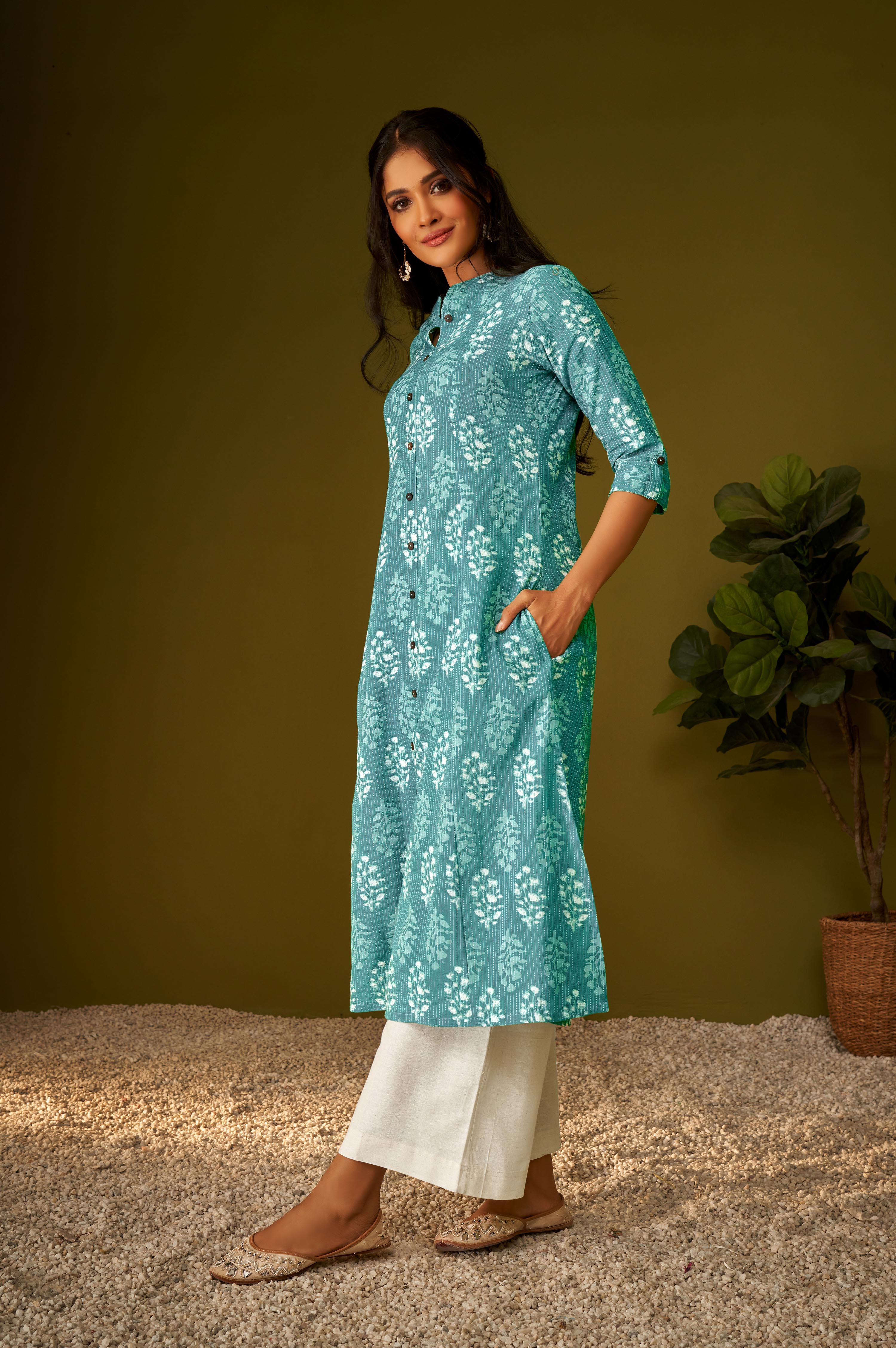 Elevate your everyday ethnic style with this Sky Blue Cotton A-Line Kurta, designed with timeless ethnic motifs and a flattering calf-length silhouette. The soft and breathable cotton fabric keeps you comfortable throughout the day, while the elegant Mandarin collar adds a touch of sophistication. Perfect for office wear, festive gatherings, or casual outings, this kurta brings together style, comfort, and tradition in one beautiful piece.