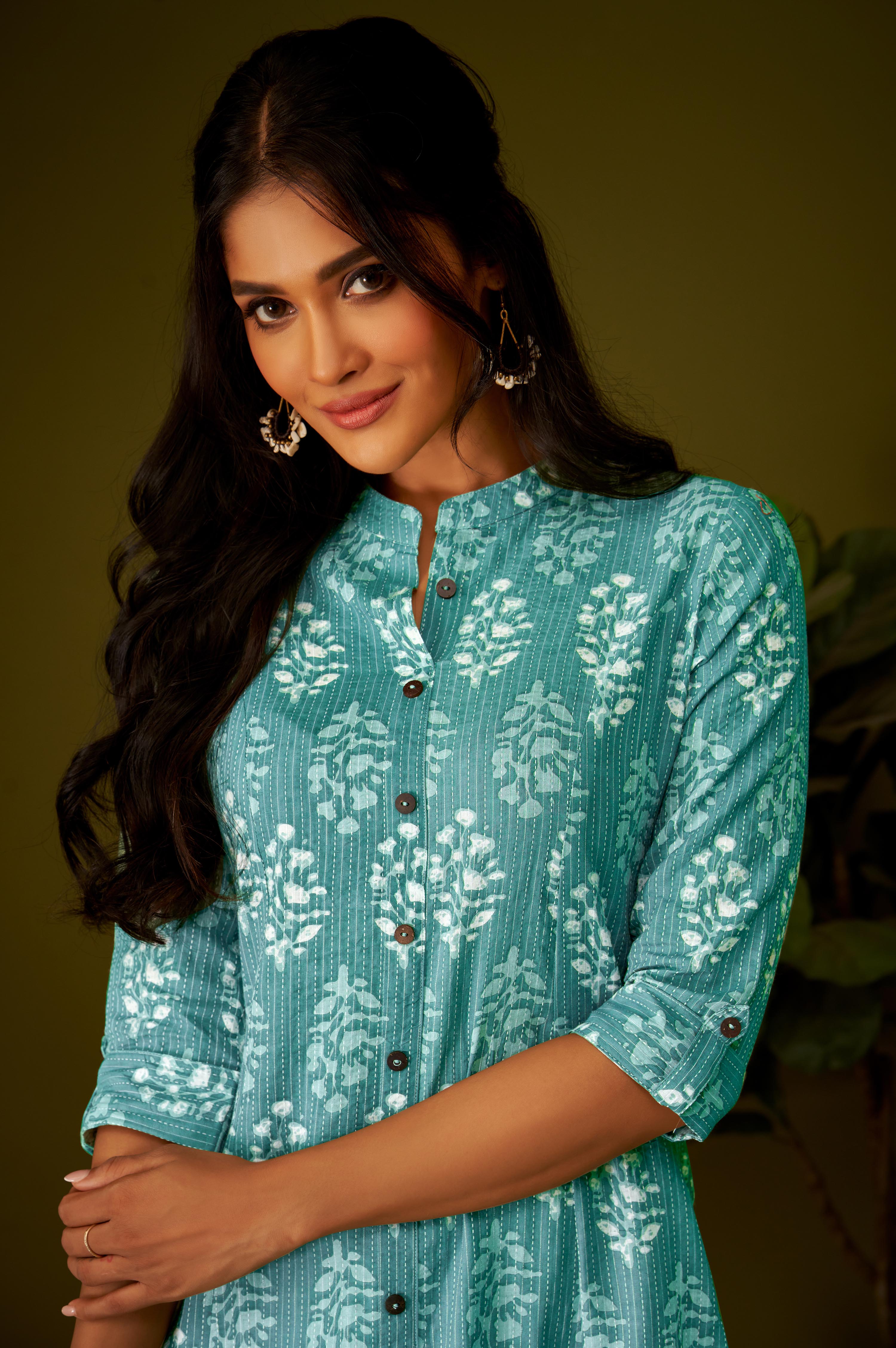 The rich and opulent fabric ensures comfort and durability, making it perfect for any occasion. Be the epitome of style and sophistication in our olive green A-Line Ethnic Kurti, a true work of art.
