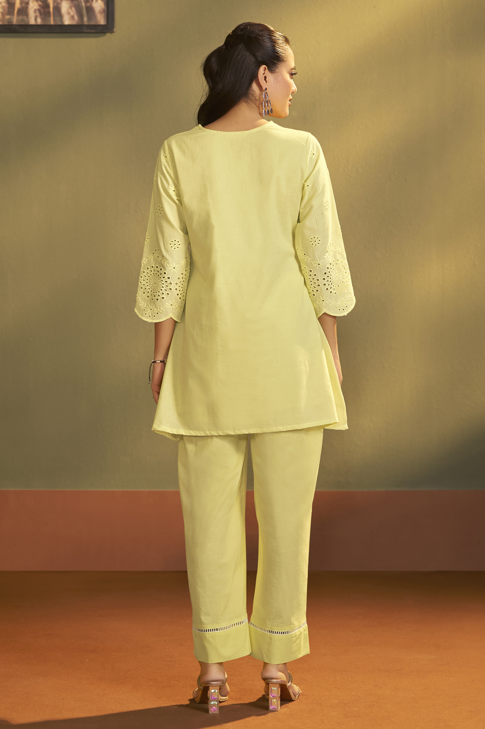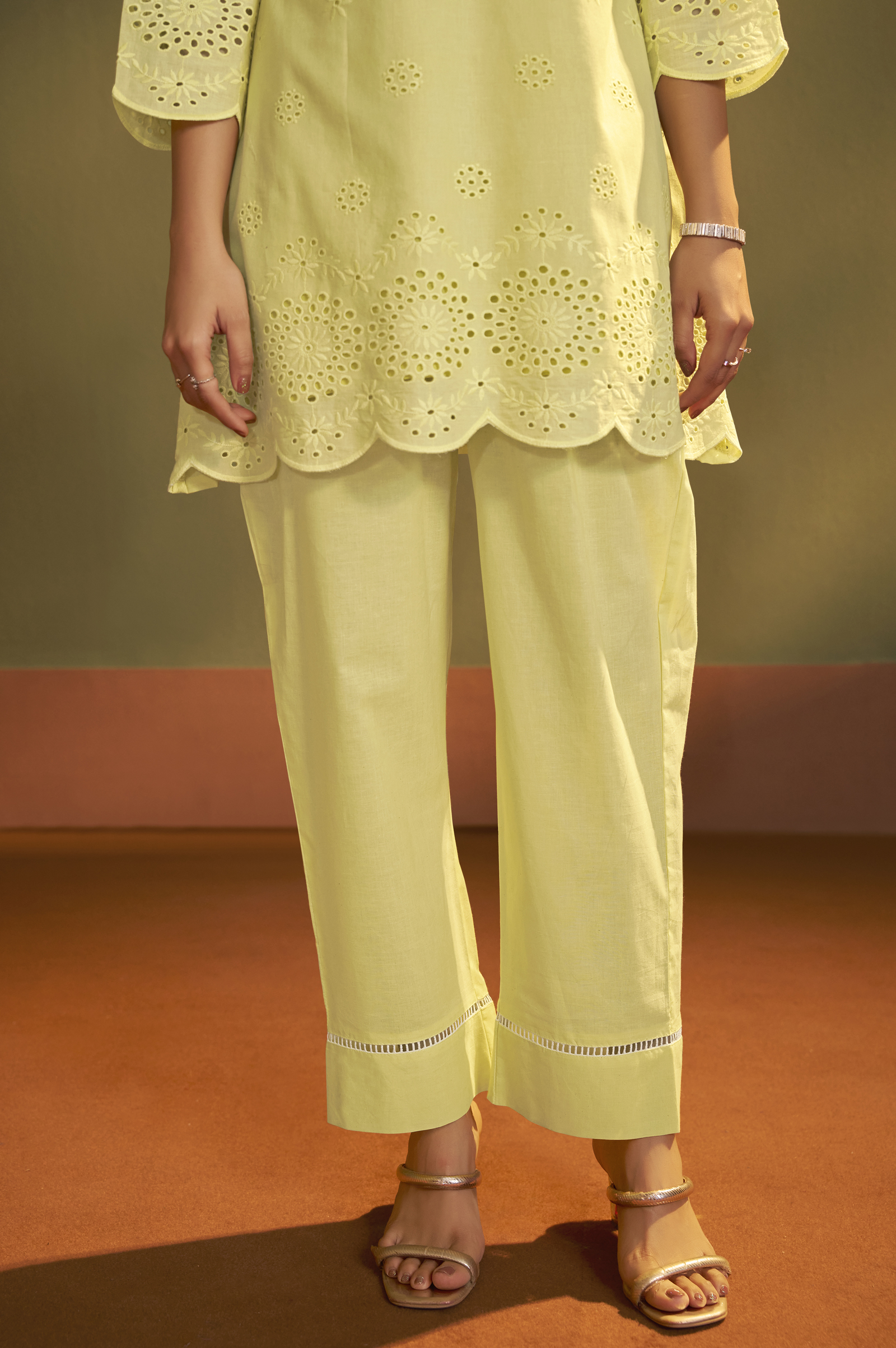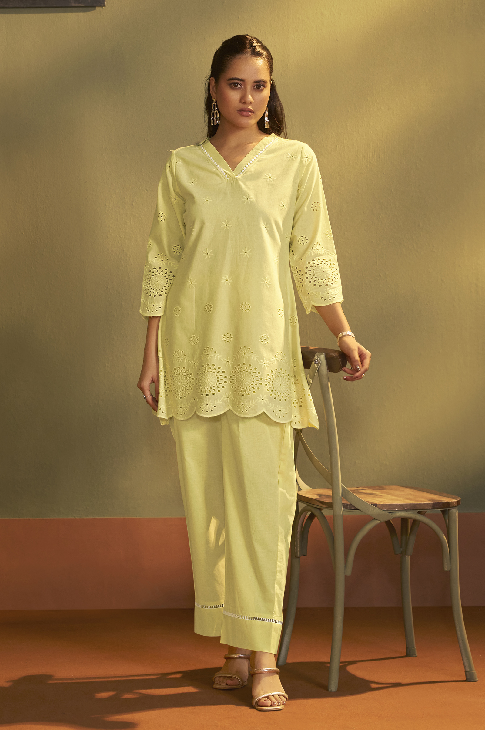 • Enhance your festive-casual wardrobe with this elegant Yellow Pure Cotton Co-Ord Set, thoughtfully crafted for comfort and style. The set features a beautifully designed Schiffli-embroidered top with delicate lace detailing, giving it a premium and feminine look. Made from pure cotton, the top ensures breathability and all-day comfort, while the flattering V-Neck, 3/4th Regular Sleeves, and Hip-Length Straight silhouette create a polished appearance.
