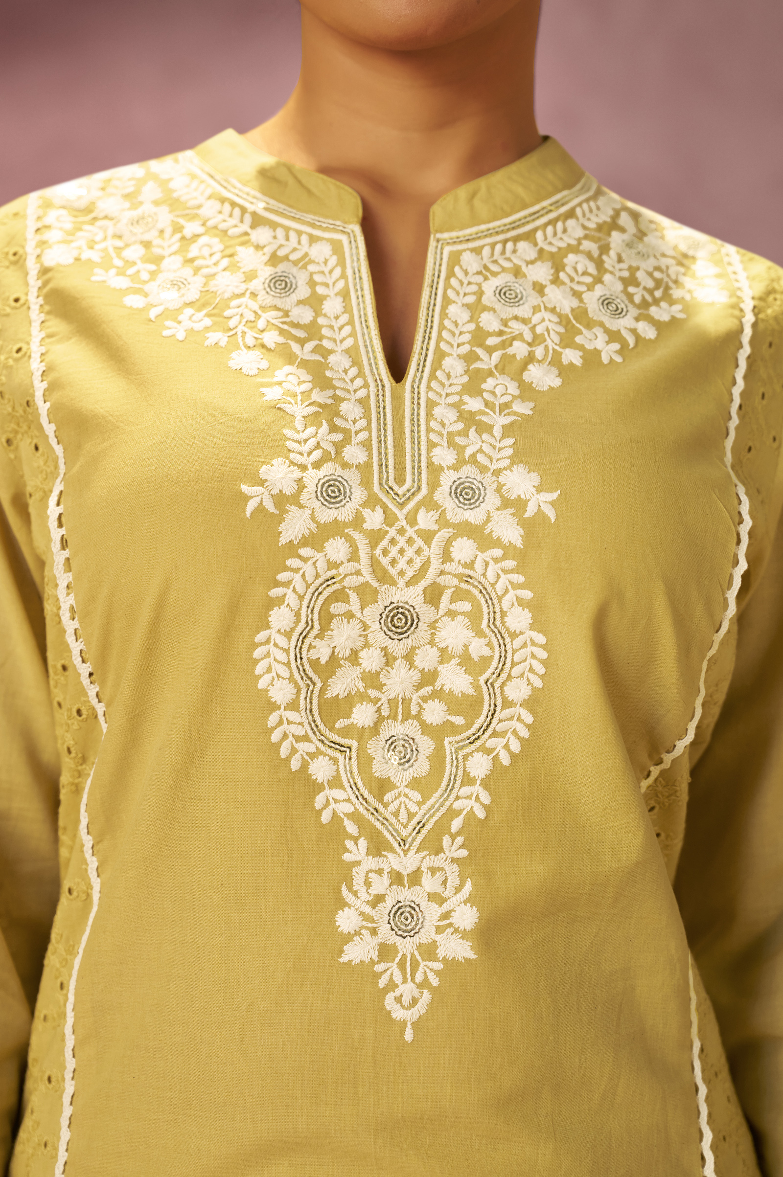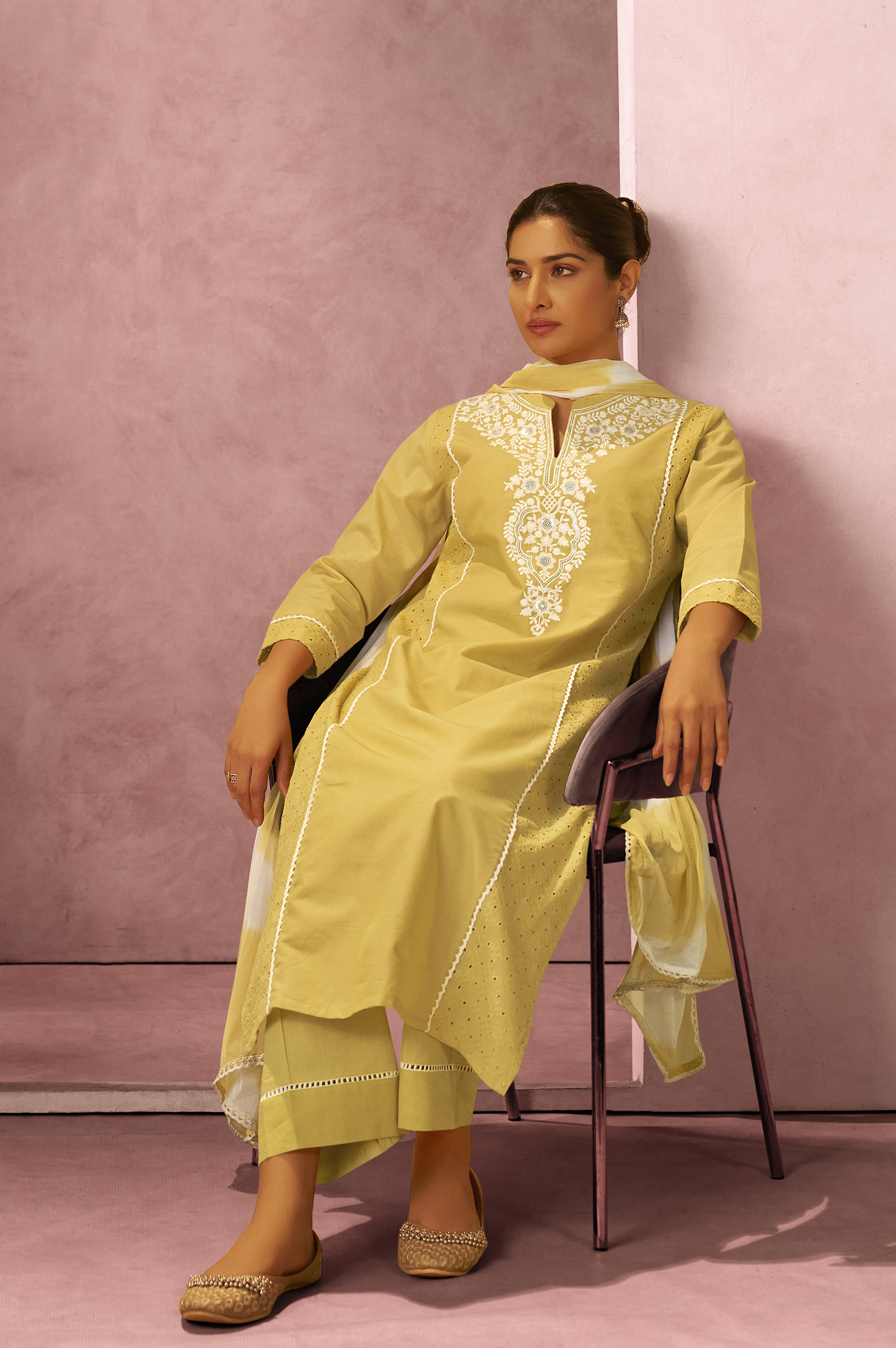 • Elevate your ethnic wardrobe with this elegant yellow kurta set featuring delicate Schiffli embroidery. Crafted from pure cotton, the straight calf-length kurta offers breathable comfort and effortless style. Paired with solid cotton pants and a lightweight Najmin chiffon dupatta in yellow and white tones, this set is perfect for festive occasions, casual gatherings, and daytime celebrations. The mandarin collar and 3/4th sleeves add a refined, modern touch to this timeless ensemble.