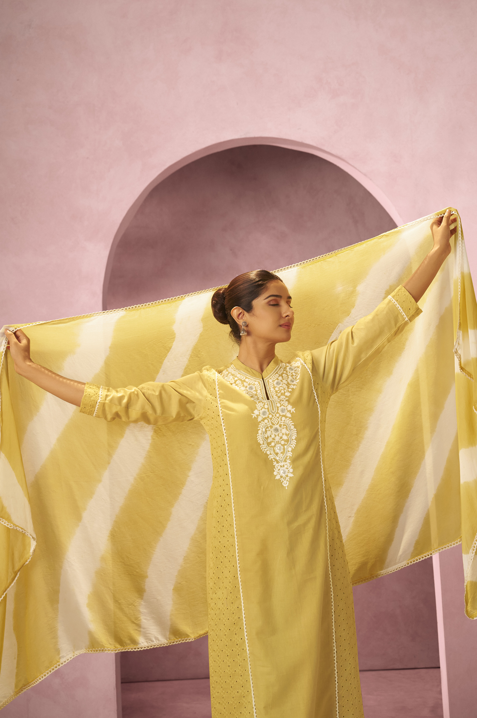 • This yellow pure cotton Schiffli embroidered kurta set with dupatta is perfect for festive and casual wear. Featuring a straight calf-length kurta with a mandarin collar, cotton pants, and a Najmin chiffon dupatta, this women’s ethnic kurta set offers comfort, elegance, and timeless style for every occasion.