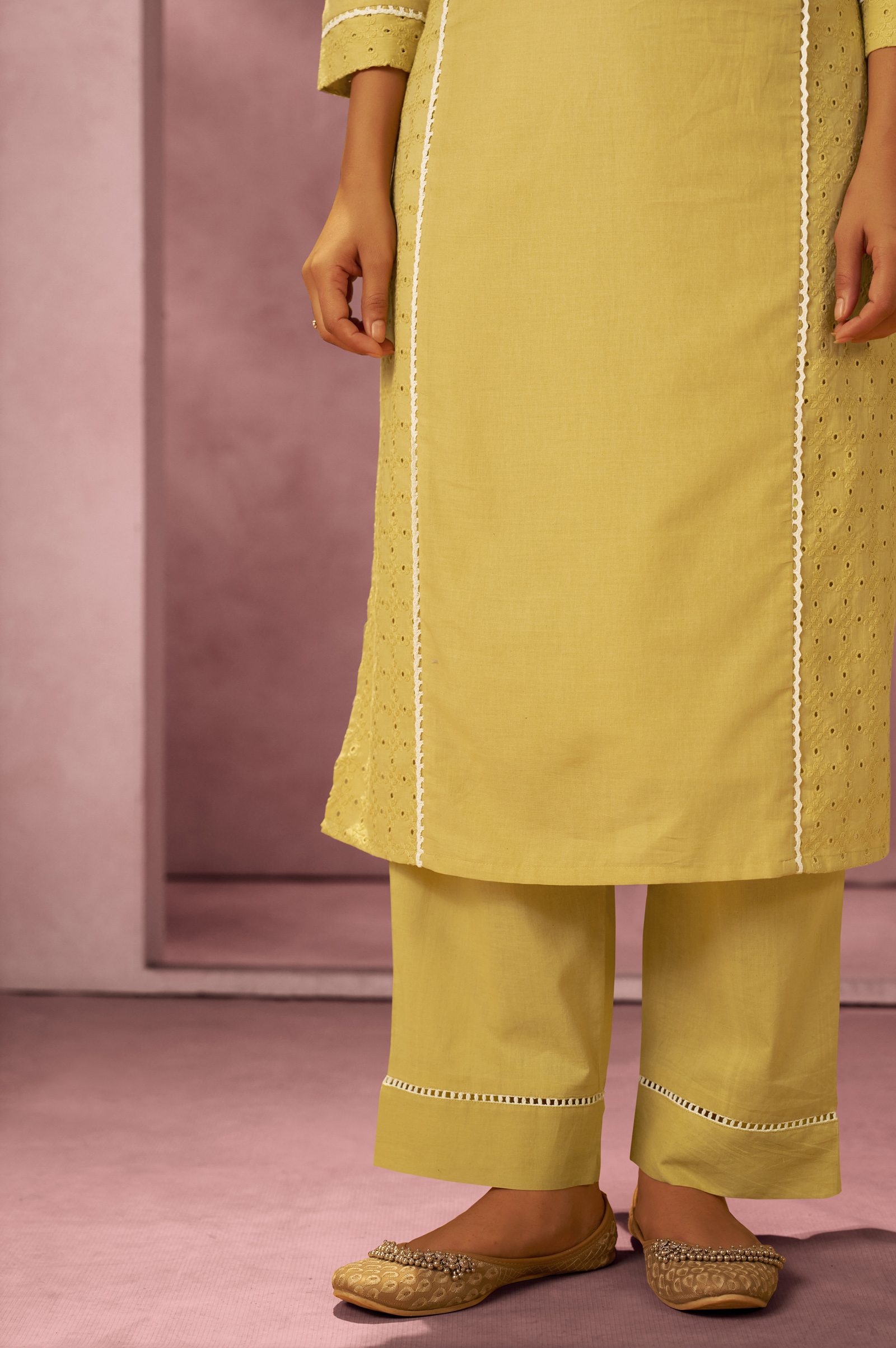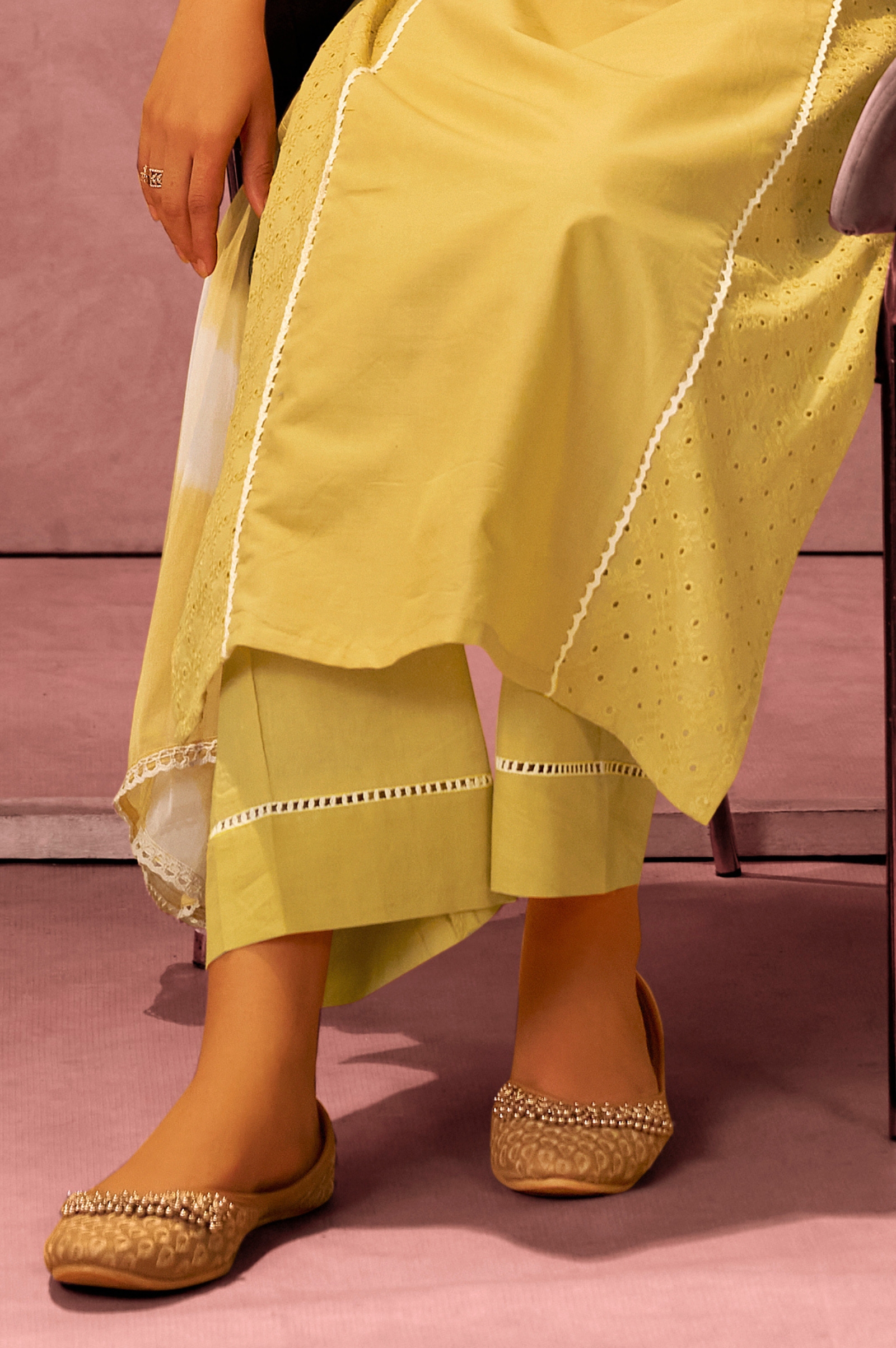 • The bottom is crafted from pure cotton fabric in a solid yellow shade. Designed with a long, comfortable fit, it complements the embroidered kurta perfectly while ensuring ease of movement and breathable wear.